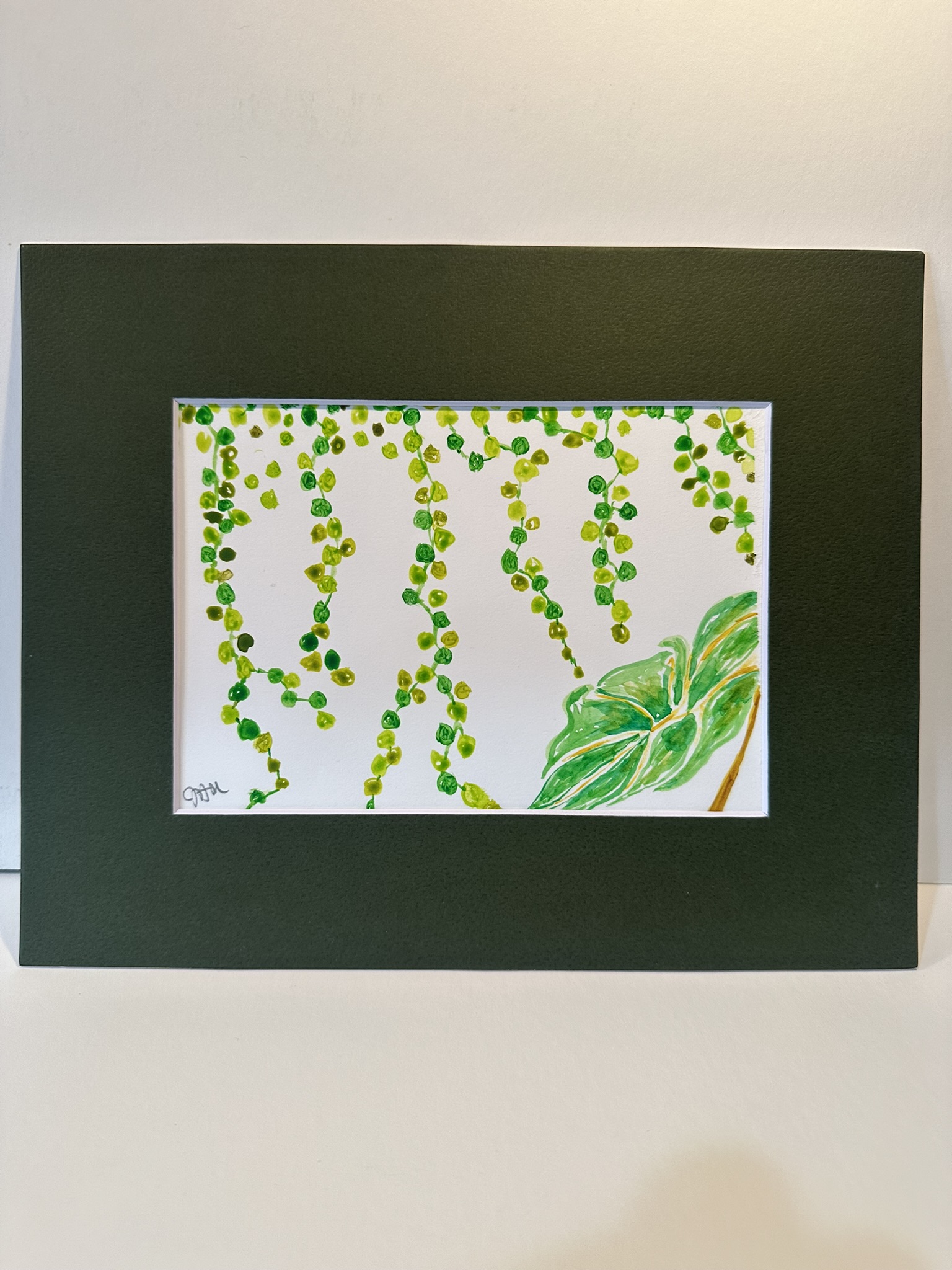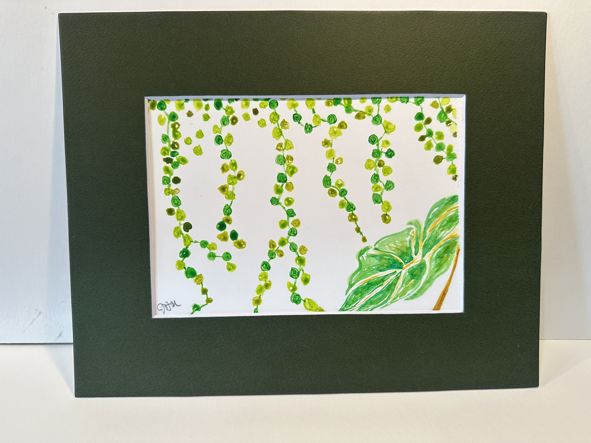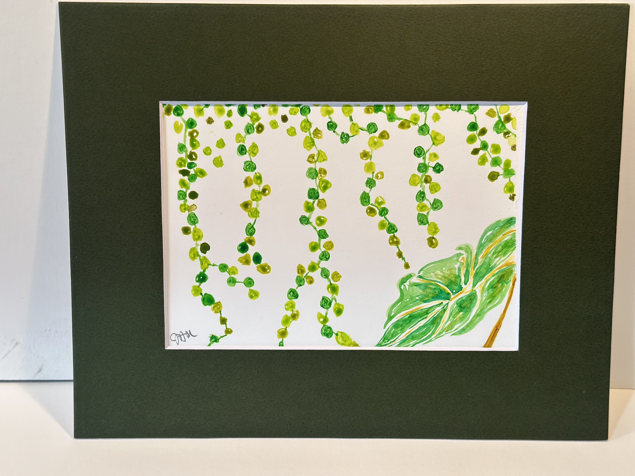 The painting features a vibrant depiction of a plant with cascading green beads or leaves, likely representing a string of pearls plant or a similar hanging succulent. The foliage is detailed in varying shades of green, conveying a sense of lushness and growth, with one prominent leaf in the lower corner providing a focal point against the stark white background.