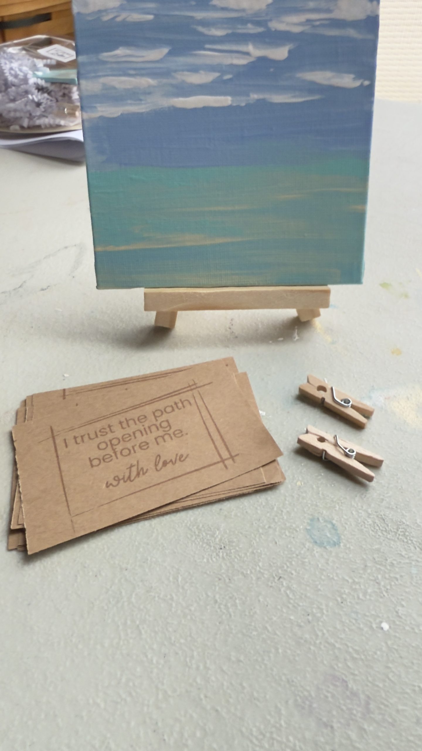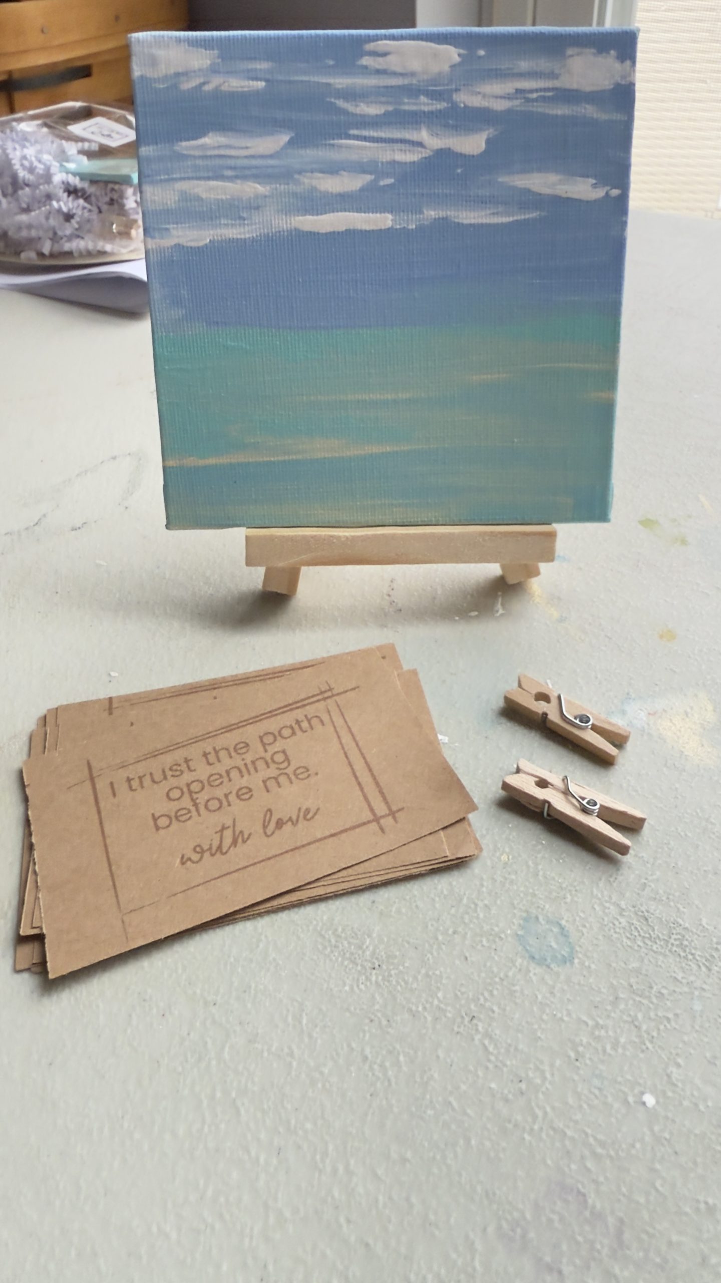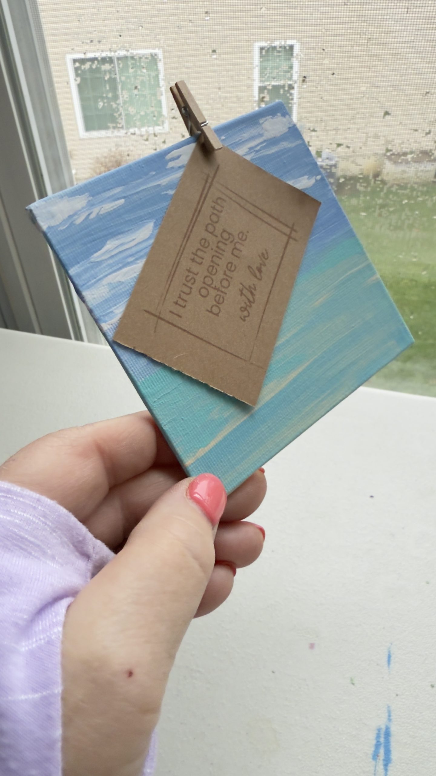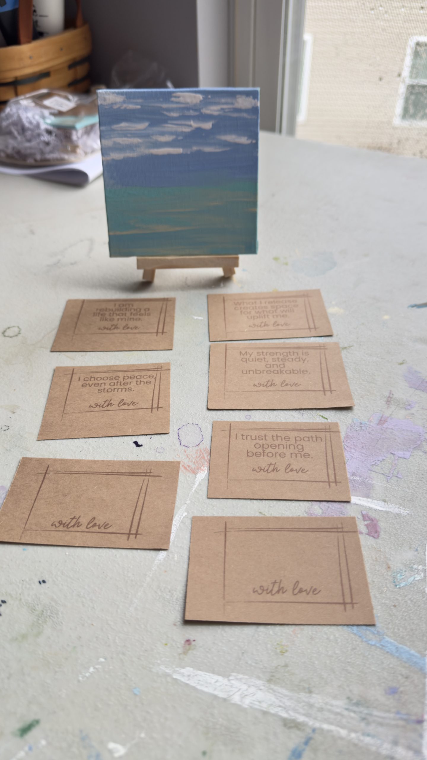 Small enough to sit on a desk, shelf, or nightstand, it brings a sense of openness and reset — a visual reminder that calm is always available, even on hard days. Paired with an affirmation card, this piece becomes a daily nudge toward peace, clarity, and emotional ease.