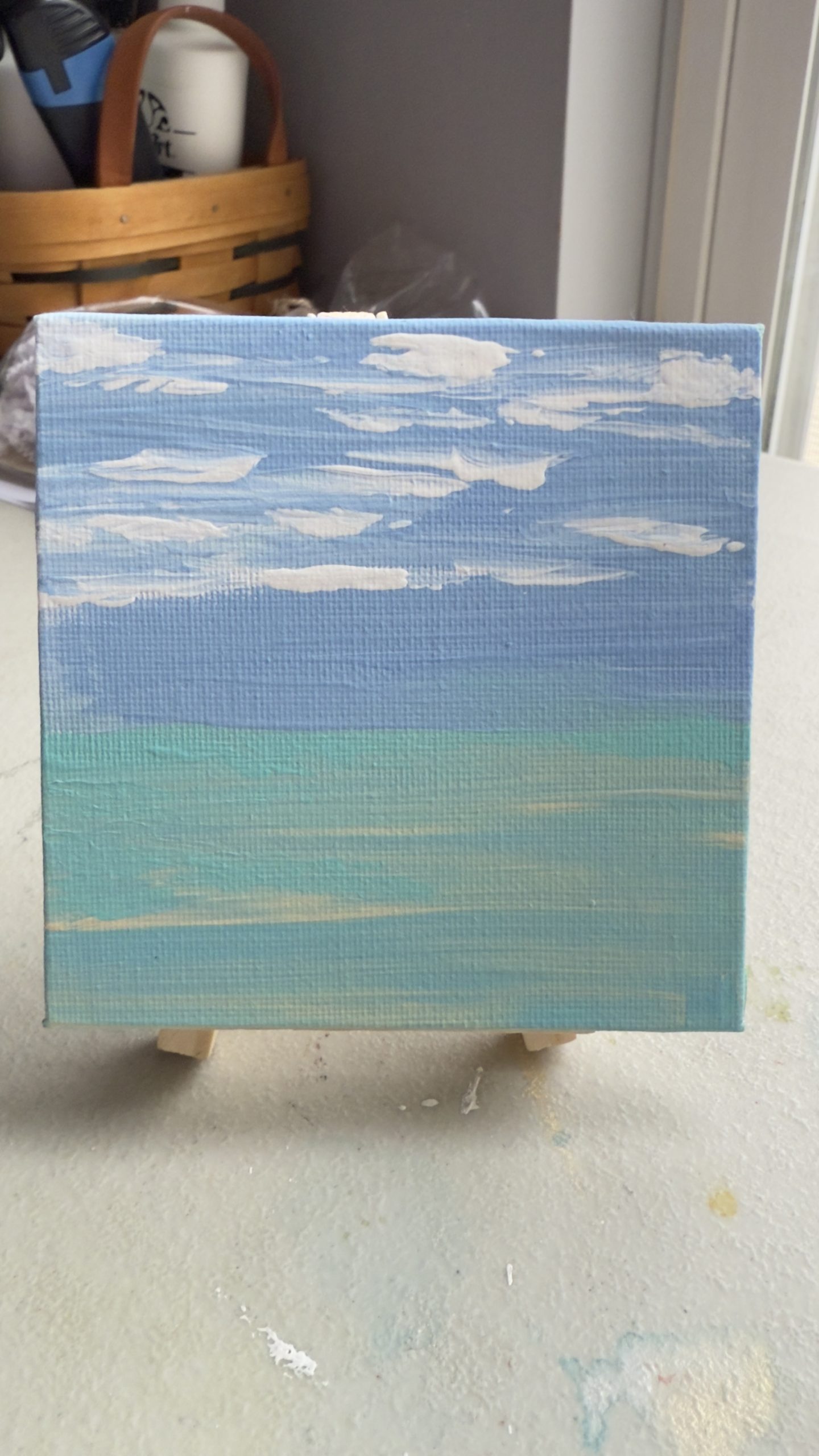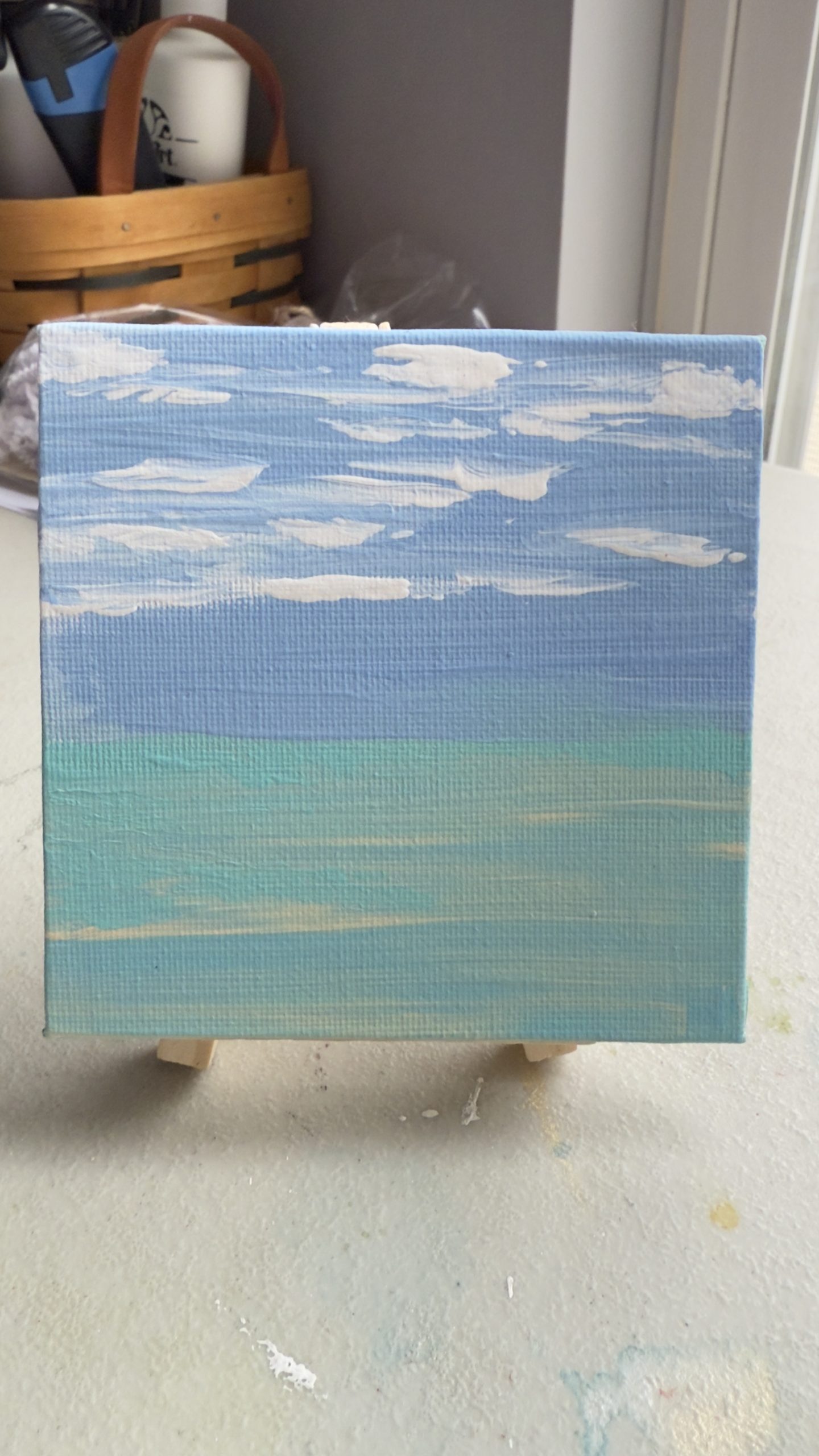 This 4×4 hand-painted ocean mini captures the serenity of a quiet shoreline moment. Soft blues, turquoise waters, and gentle clouds blend into a peaceful horizon that feels like a long, steady exhale.