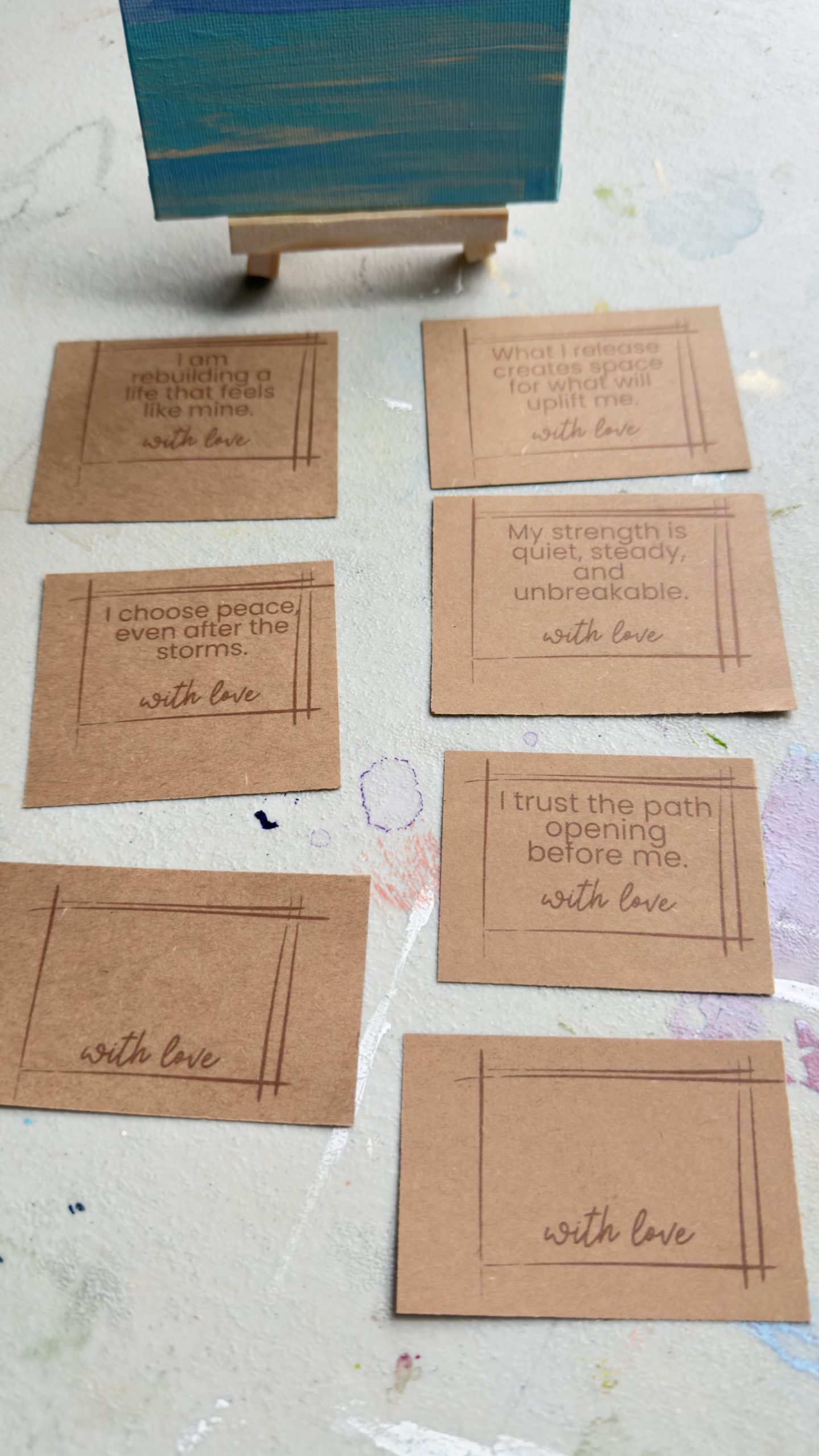 and seven empowering sayings — five printed affirmations and two blank cards so you can write your own words of strength and love.