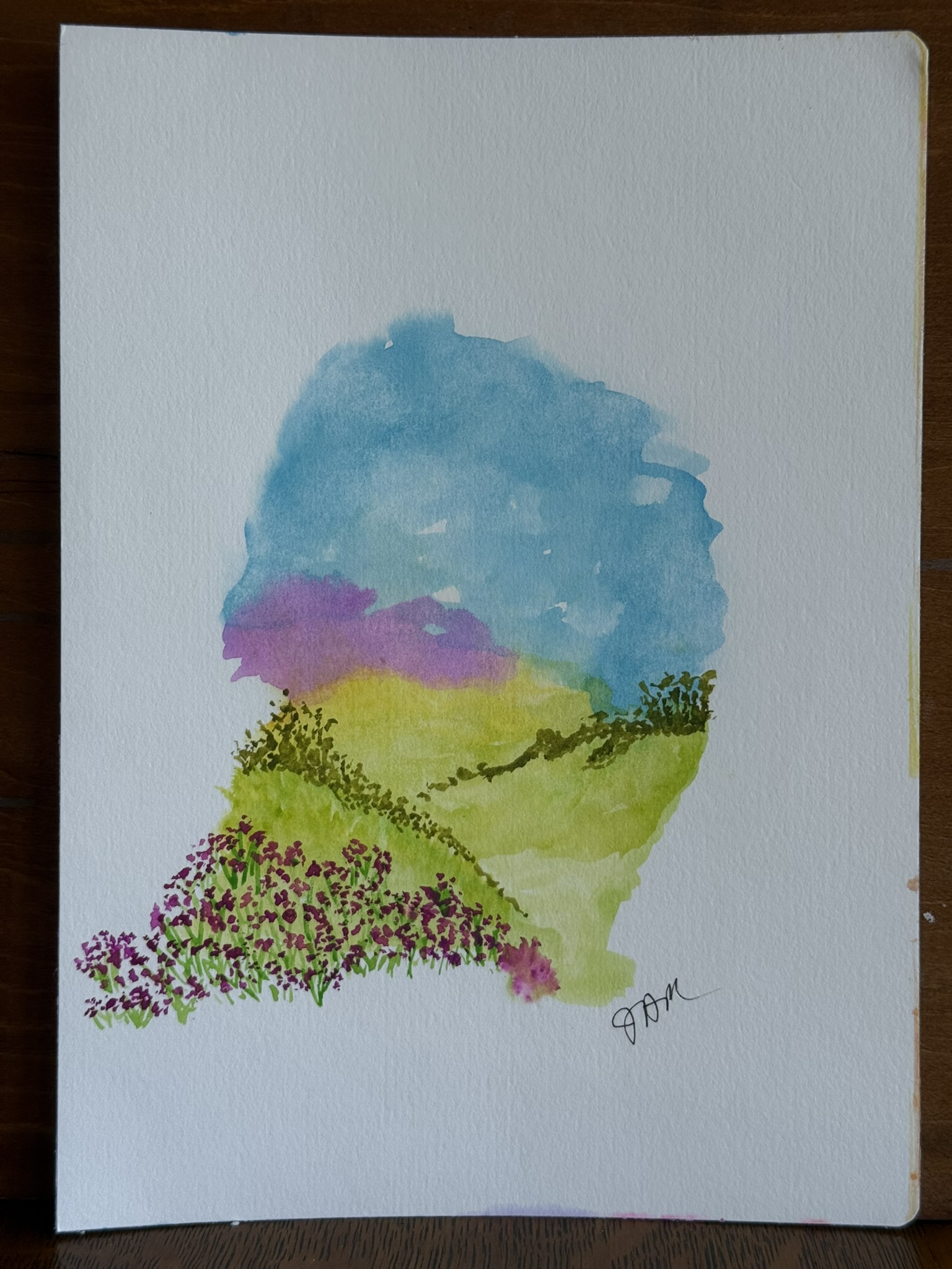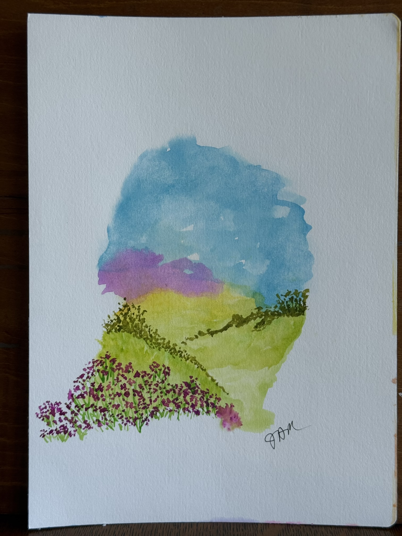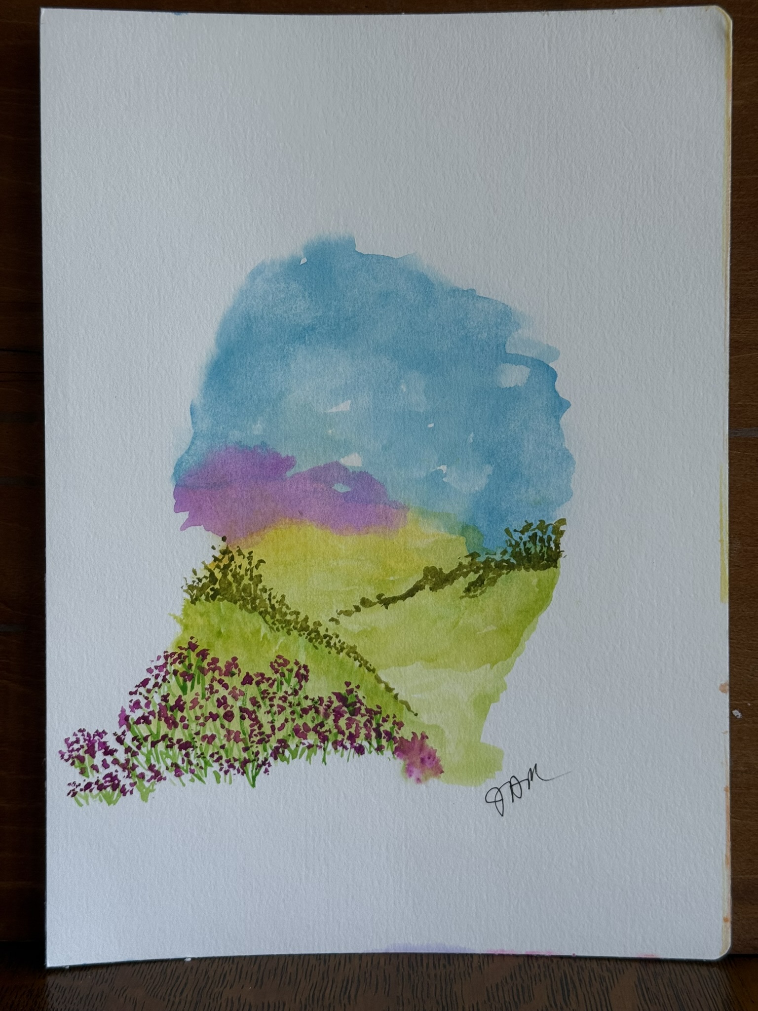 This cheerful watercolor captures the feeling of wandering through rolling hills on a bright day. Layers of blue sky, soft lavender, golden green fields, and clusters of wildflowers guide the viewer along a gentle path. Light and whimsical, this piece celebrates the beauty of open landscapes and the joy of a simple walk in nature.
