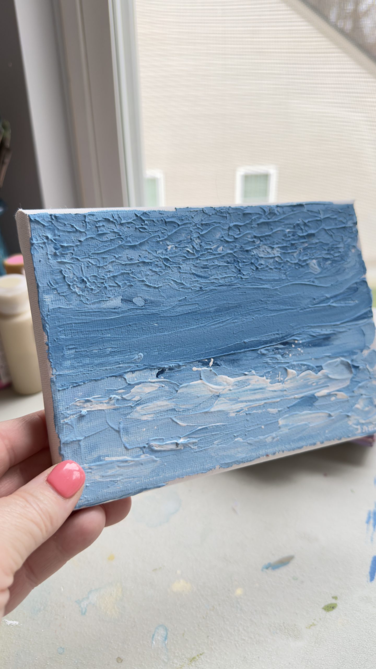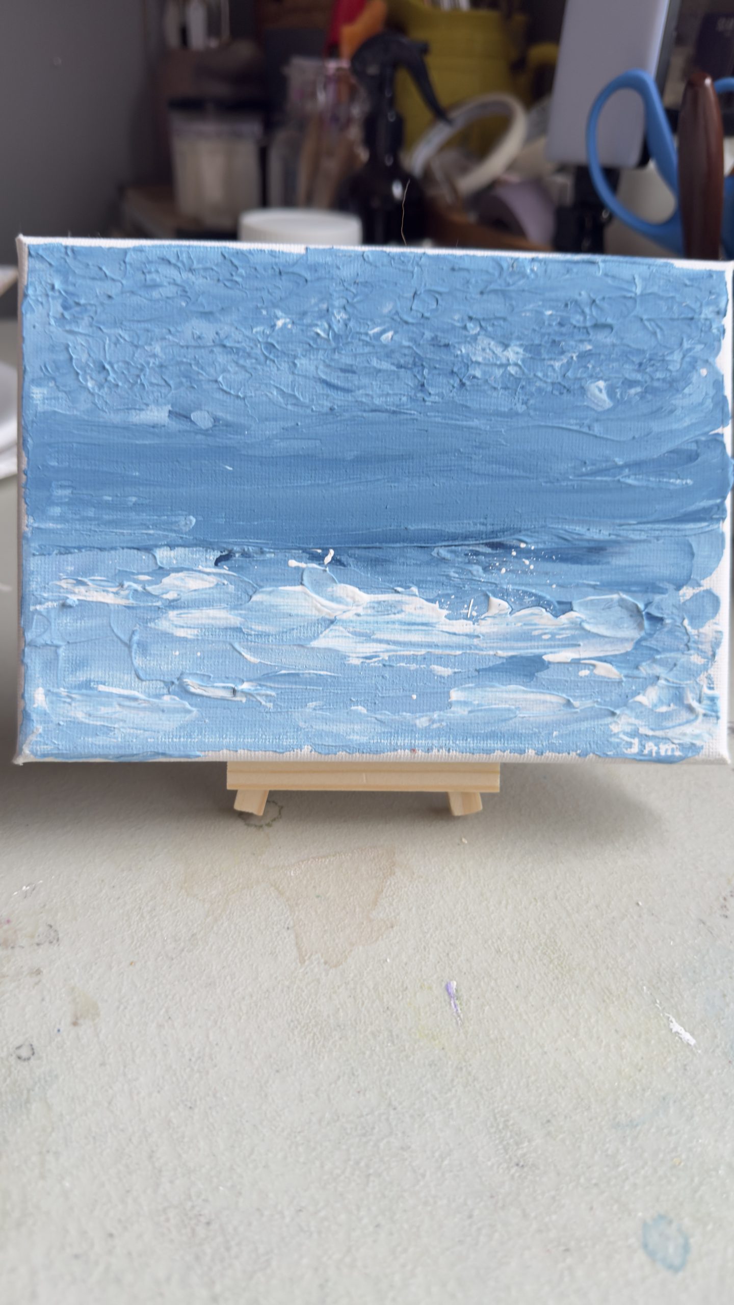 This textured 5×7 cotton ocean mini blends rich, layered blues with soft white foam, creating the feeling of standing at the edge of a quiet, powerful tide. Thick palette-knife strokes add depth and movement, while the monochromatic palette keeps the piece calming and grounded.