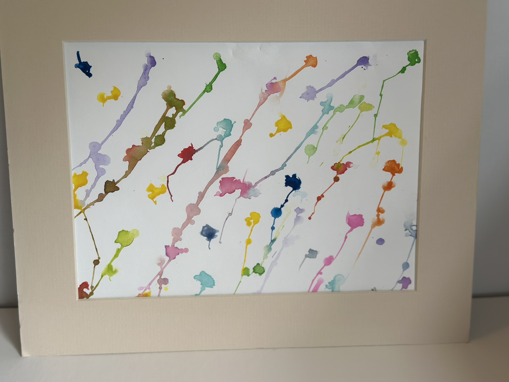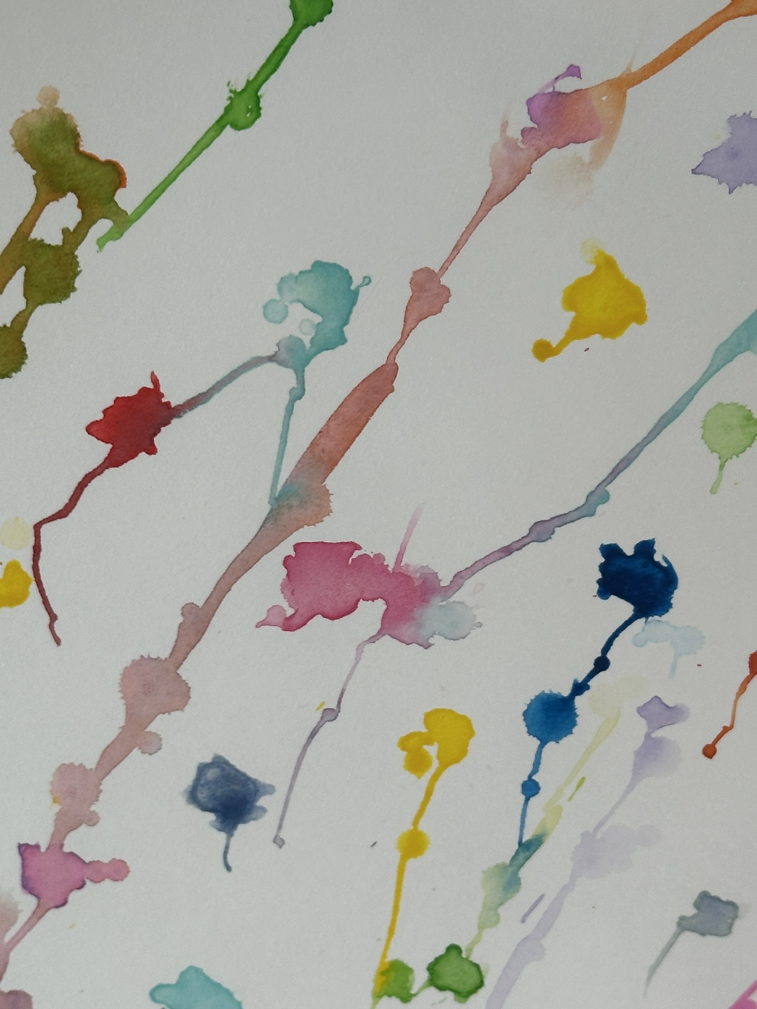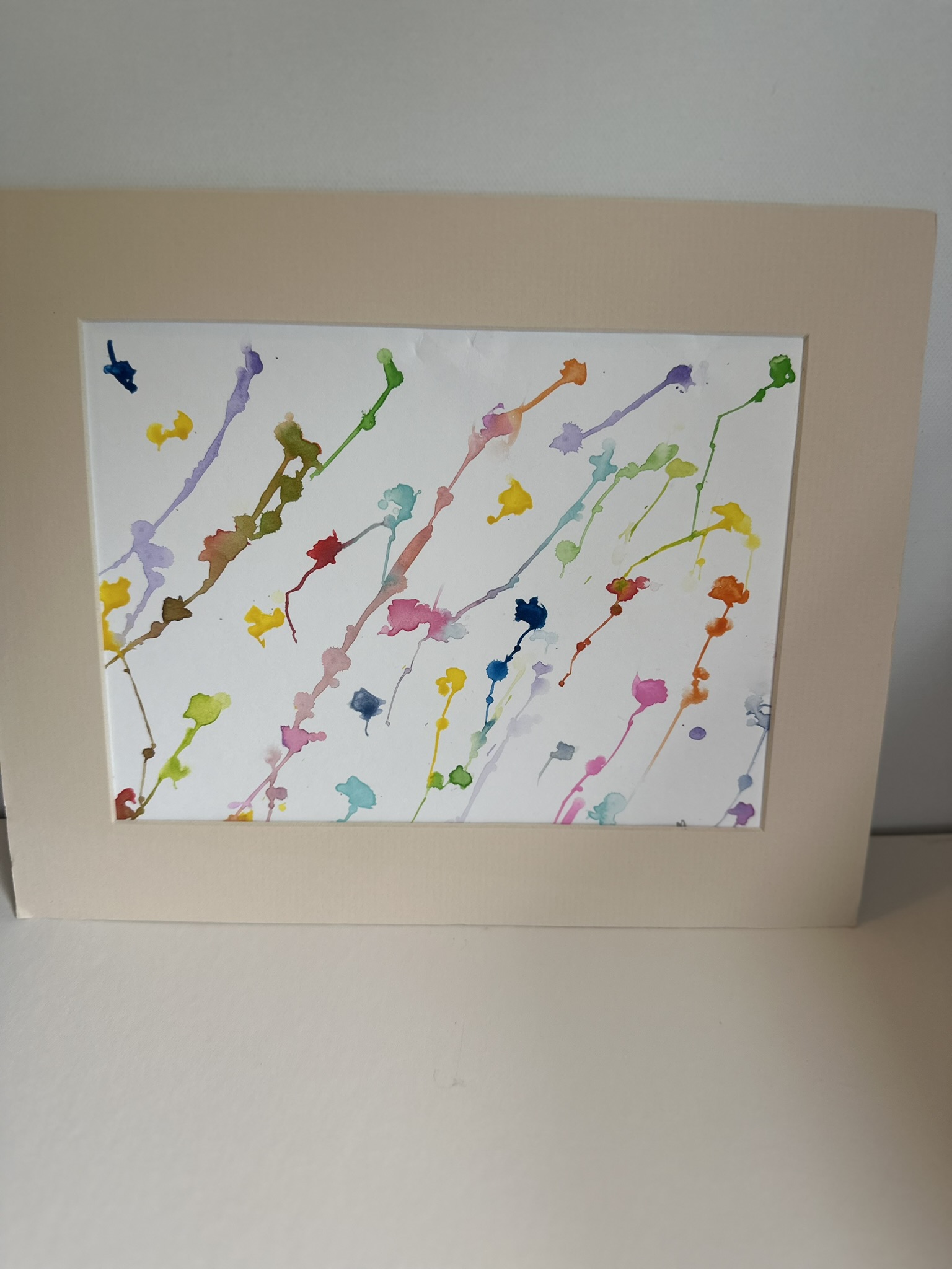 This painting beautifully embodies the lively dance of raindrops as they cascade down, each meeting the surface and creating a vivid, colorful splash. The artwork features a series of delicate, vertical streaks that evoke the rhythmic fall of rain, with each drop spreading into vibrant, spontaneous shapes upon impact. The cool, neutral background enhances the boldness of the watercolor splashes, suggesting a canvas bathed in the refreshing, dynamic energy of rainfall. The piece’s natural flow and the randomness of the droplets’ paths capture the essence of a joyful rain shower.