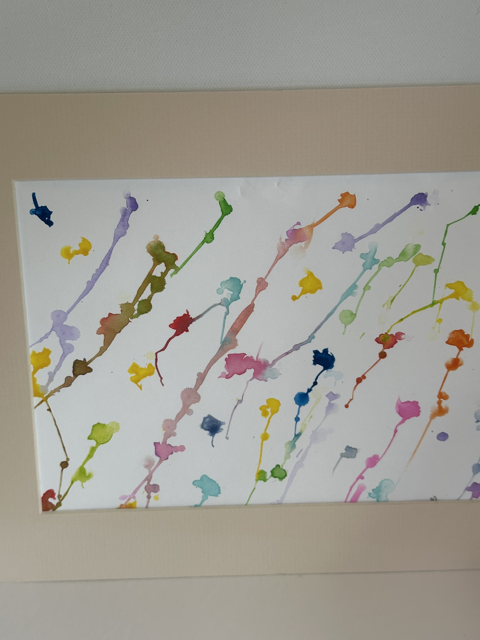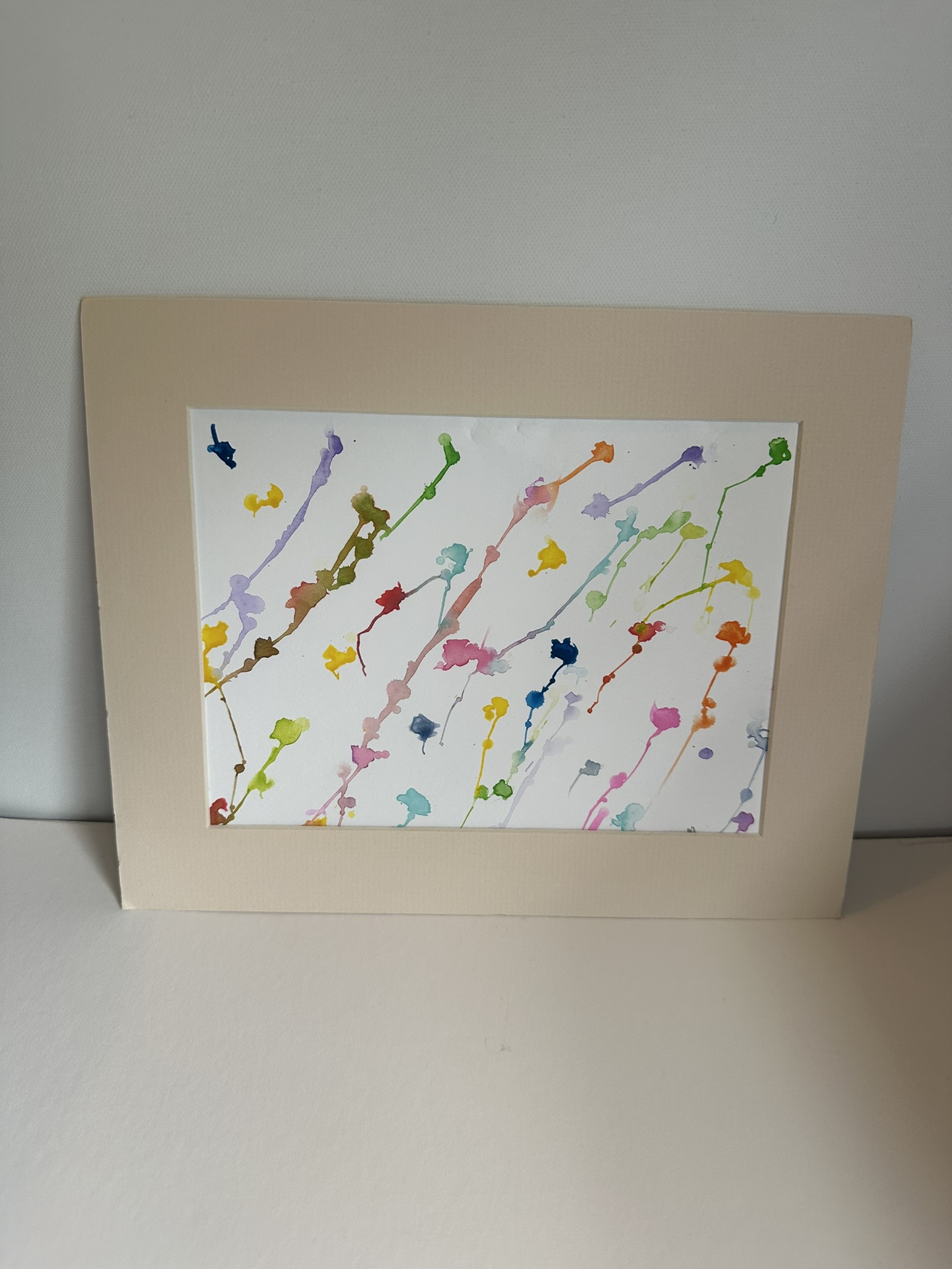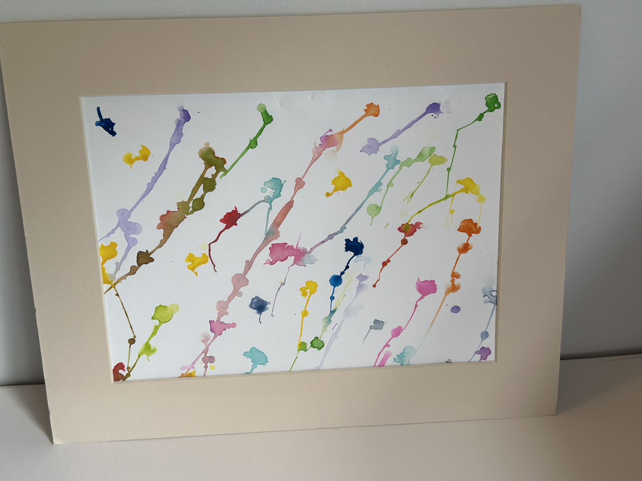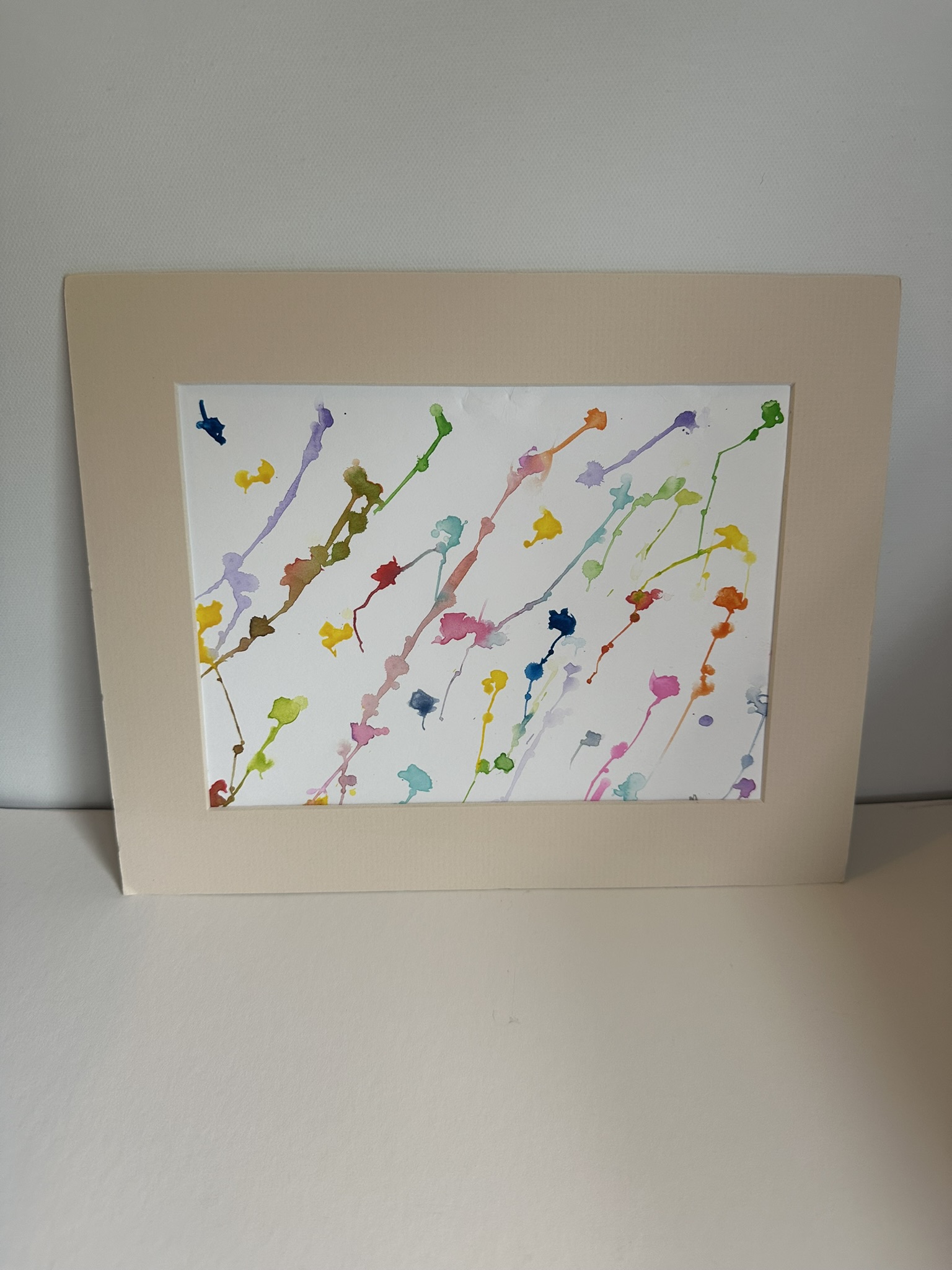 This painting beautifully embodies the lively dance of raindrops as they cascade down, each meeting the surface and creating a vivid, colorful splash. The artwork features a series of delicate, vertical streaks that evoke the rhythmic fall of rain, with each drop spreading into vibrant, spontaneous shapes upon impact. The cool, neutral background enhances the boldness of the watercolor splashes, suggesting a canvas bathed in the refreshing, dynamic energy of rainfall. The piece’s natural flow and the randomness of the droplets’ paths capture the essence of a joyful rain shower.