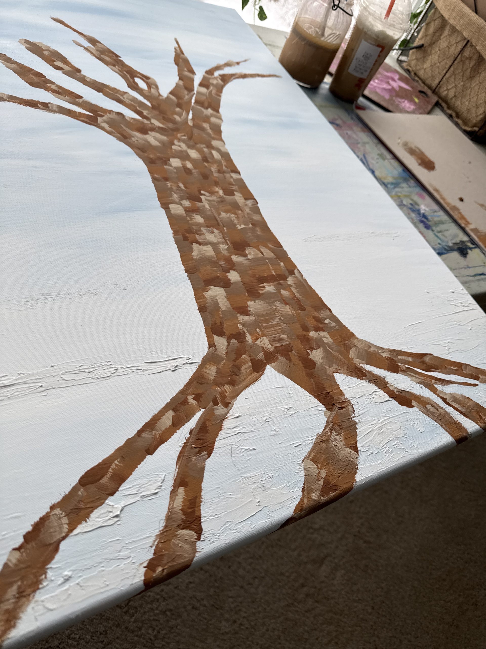 At her center stands a strong, grounded tree — her trunk layered in earthy browns, ochres, and warm neutrals that speak to resilience, lived experience, and the quiet strength earned over time. Her roots reach deep, anchoring the piece in stability, truth, and belonging — a reminder that growth begins beneath the surface, long before it is seen.