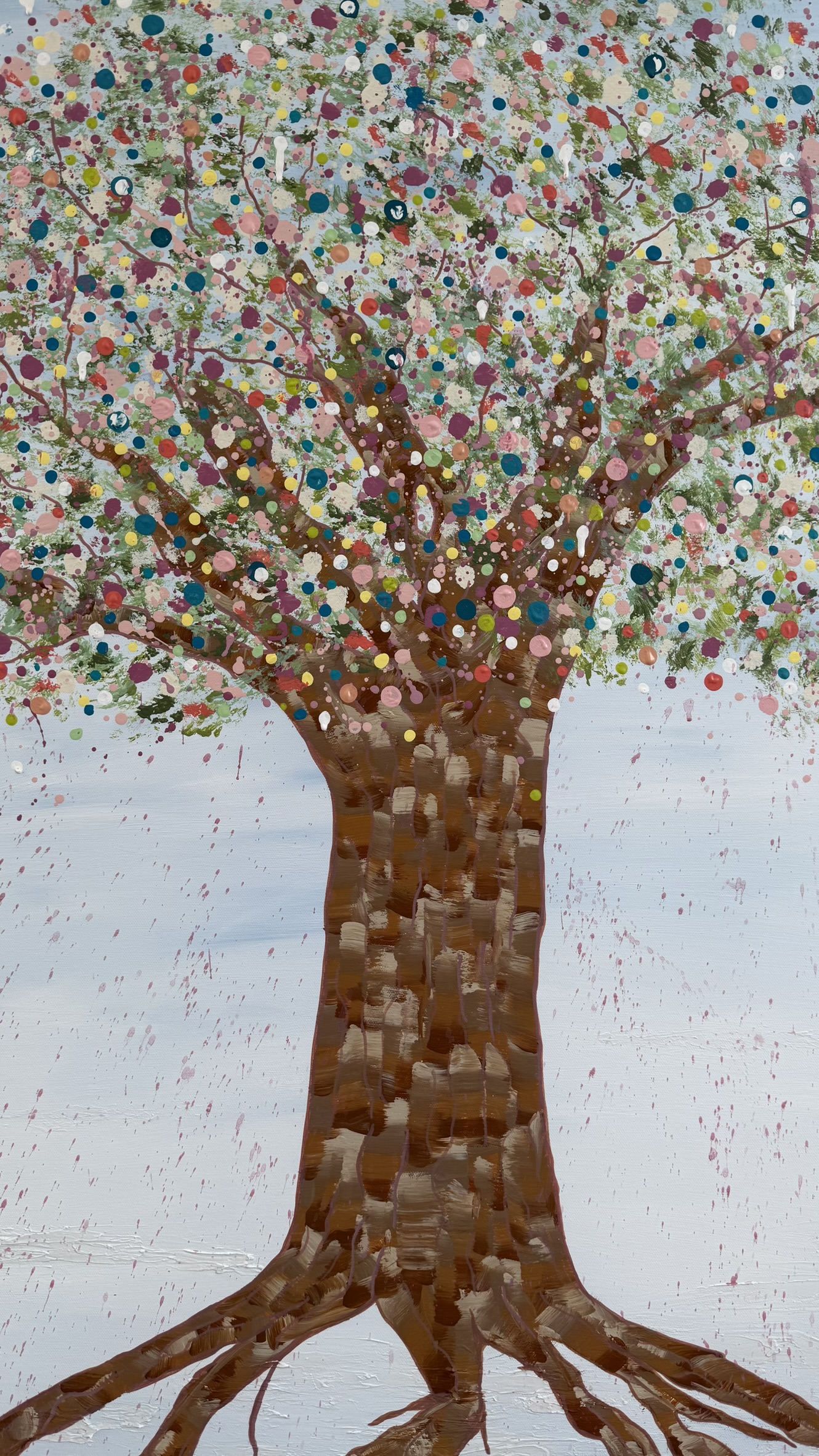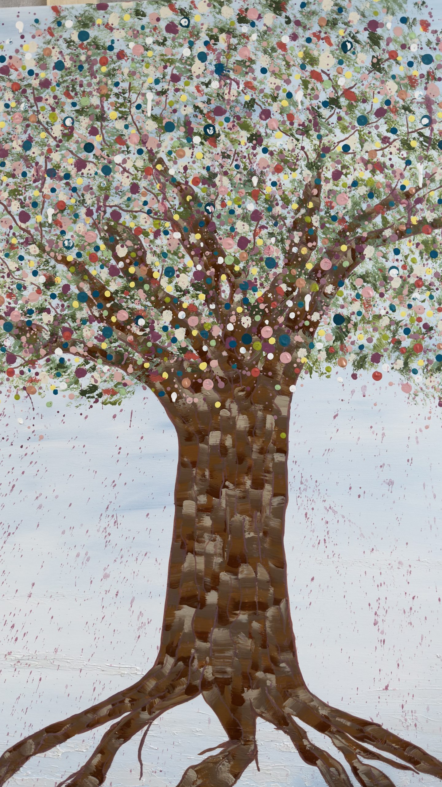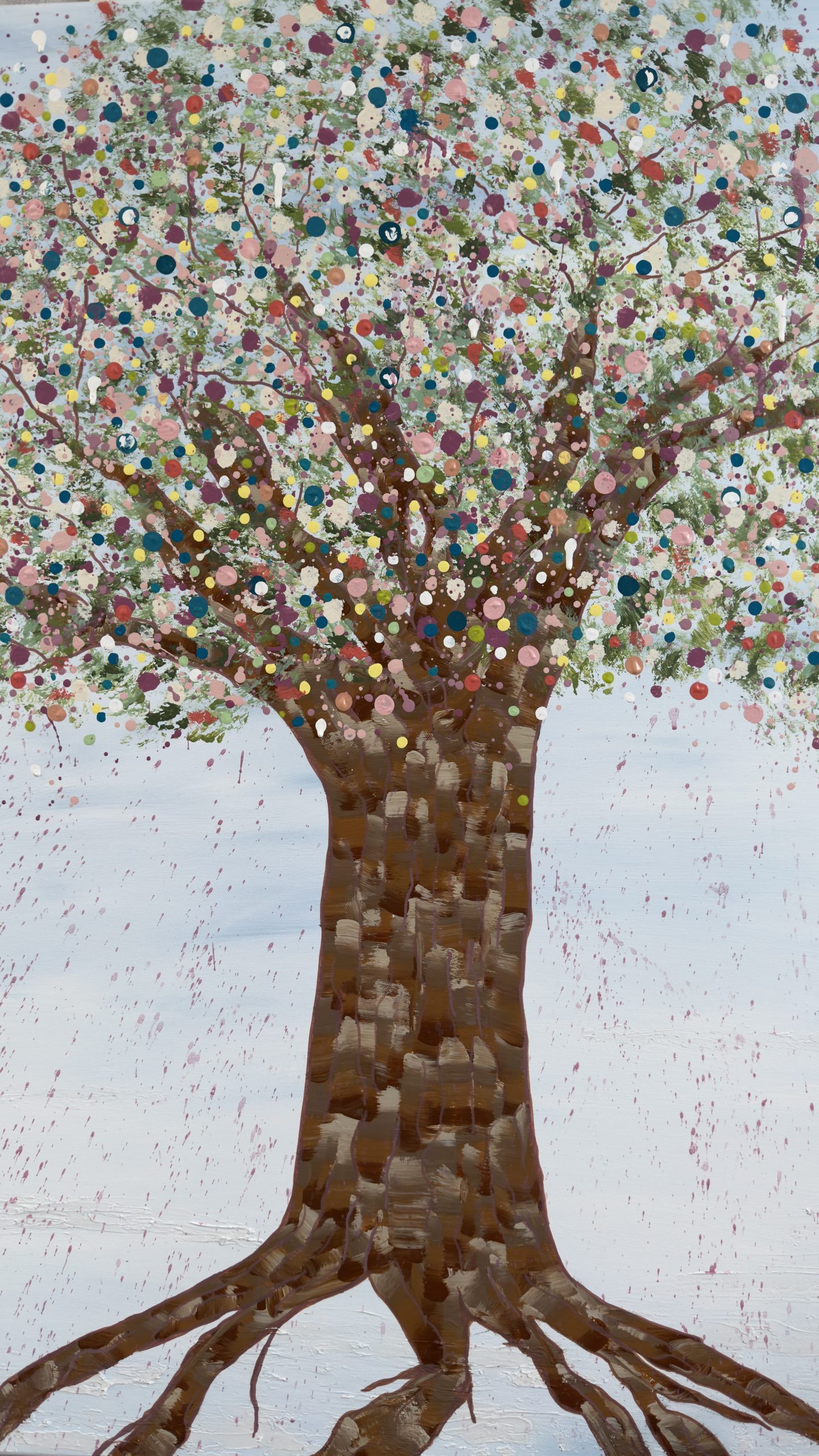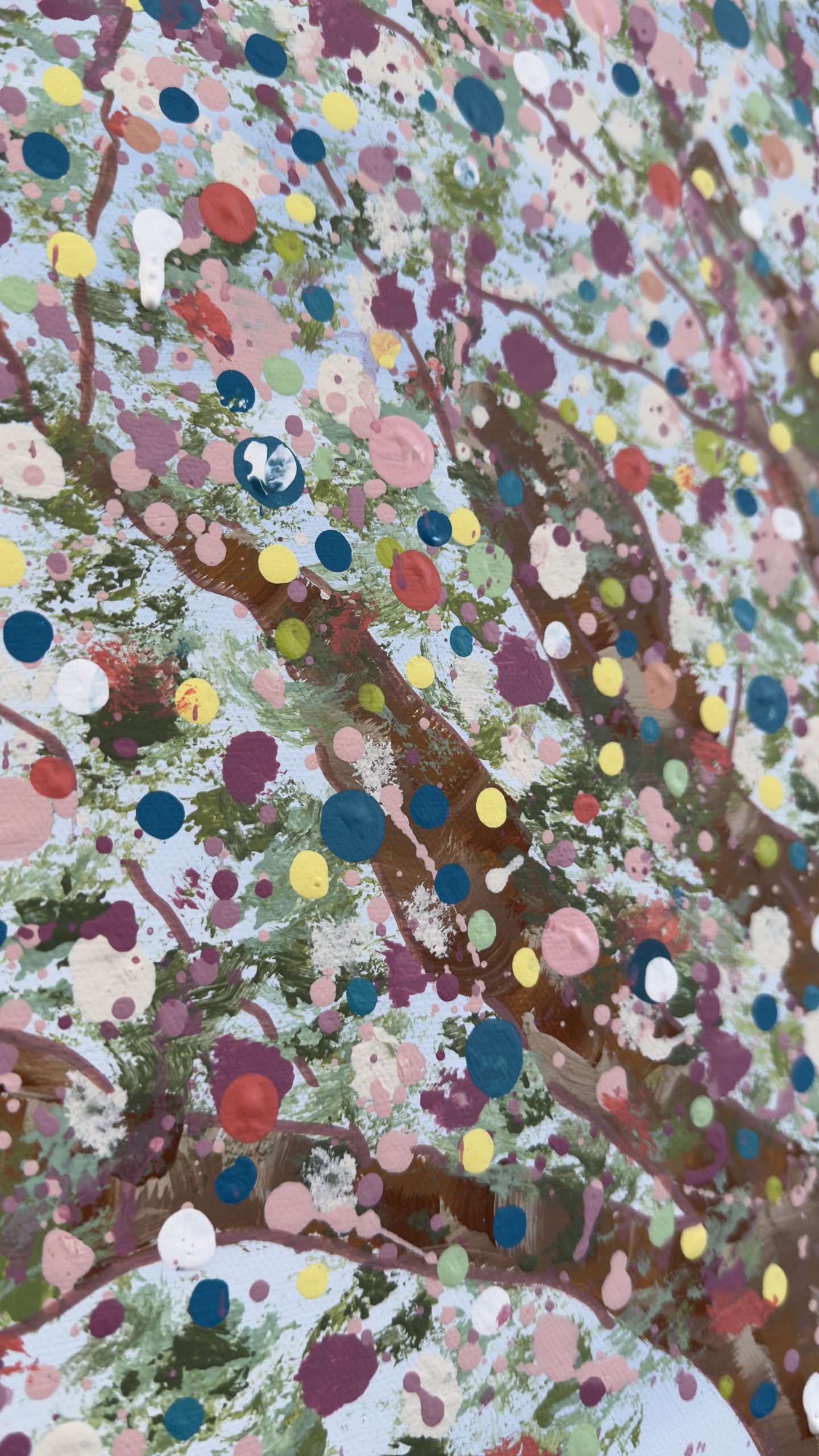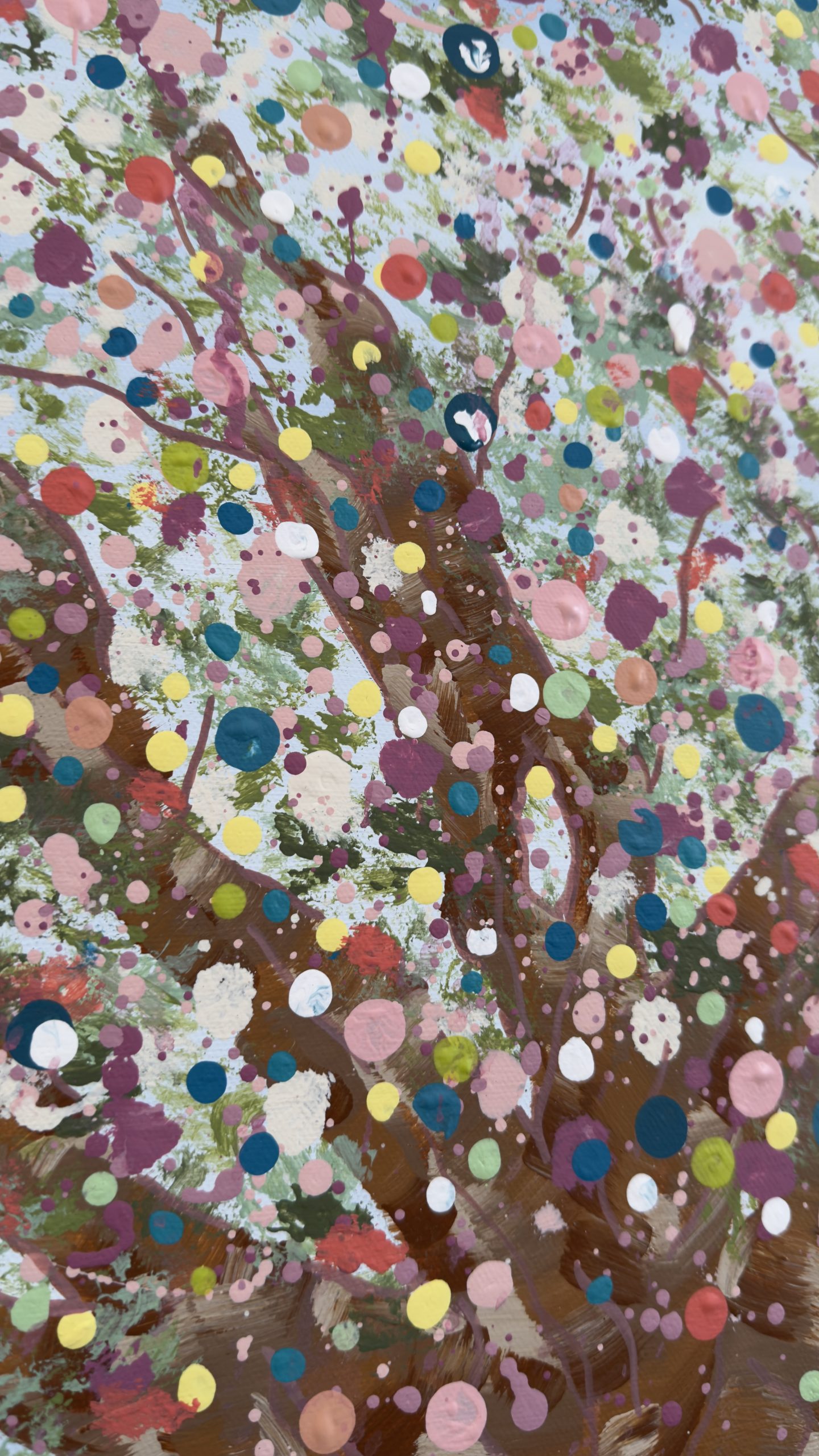 Above, her canopy opens into a celebration of becoming. A constellation of hand-placed dots, splashes, and organic marks bloom outward — playful, expansive, and alive. These thousands of gestures move like memories, moments, and emotions released, creating a sense of motion, joy, and sacred chaos. It feels like permission. Like breath. Like life returning.