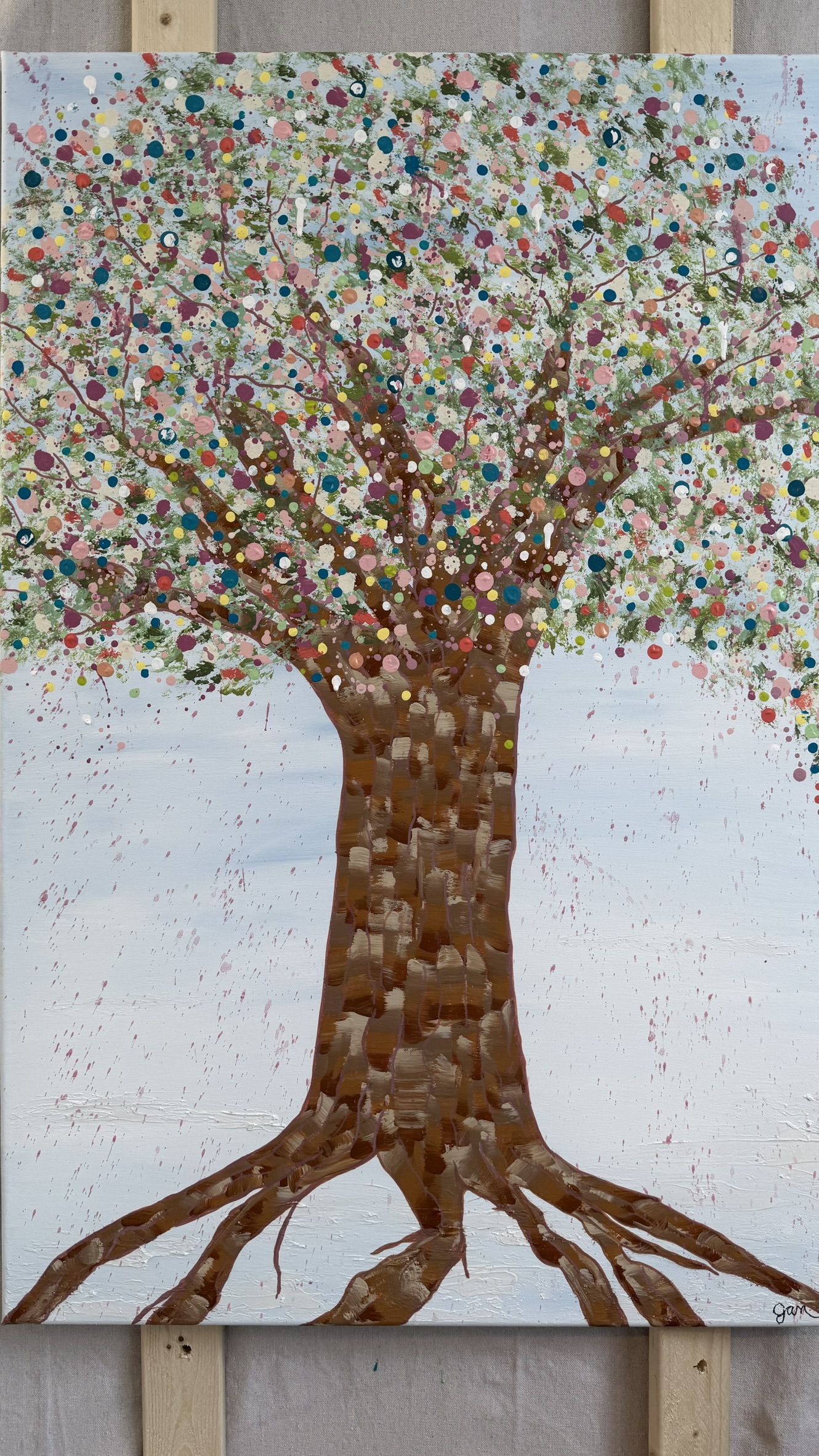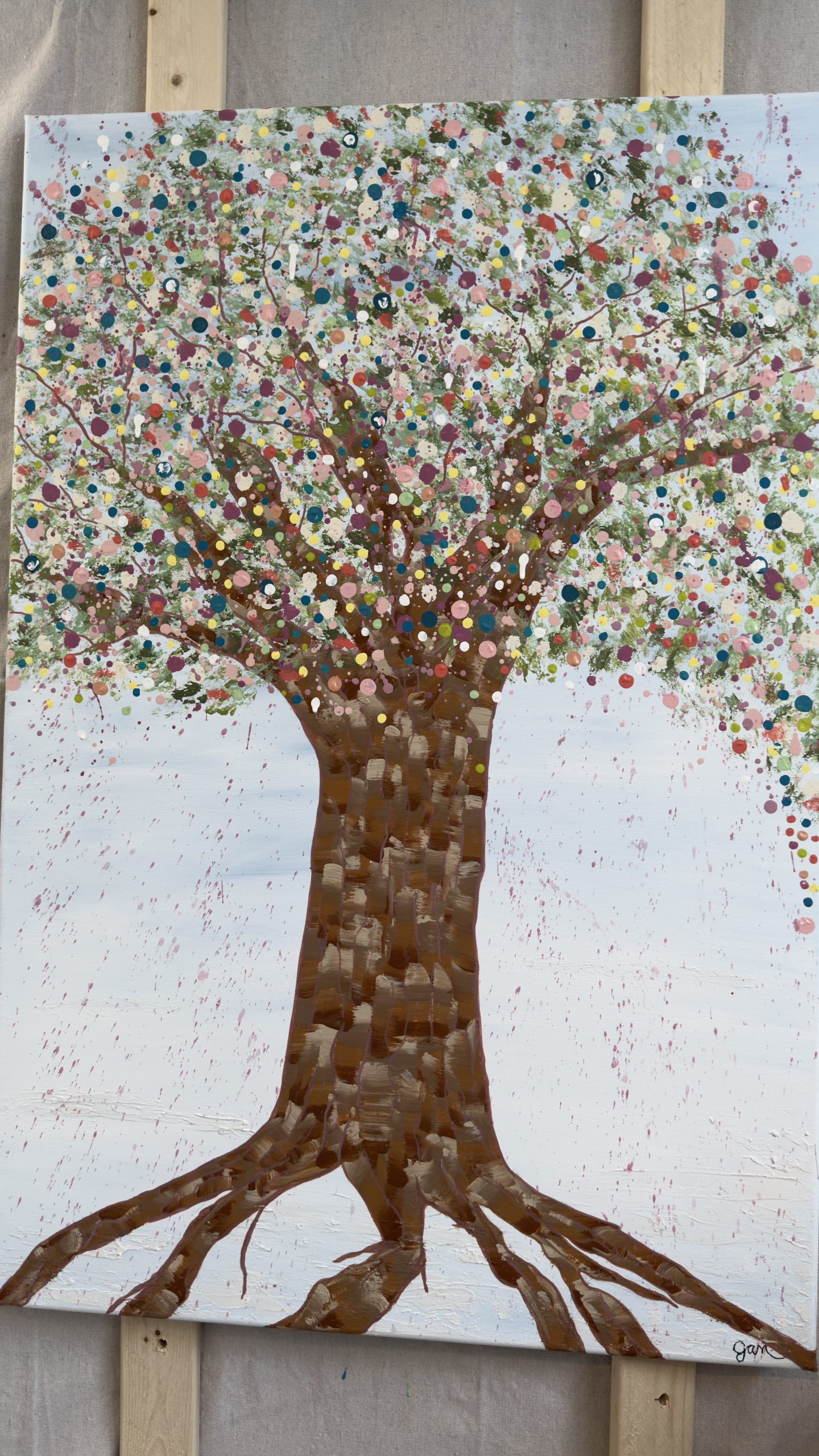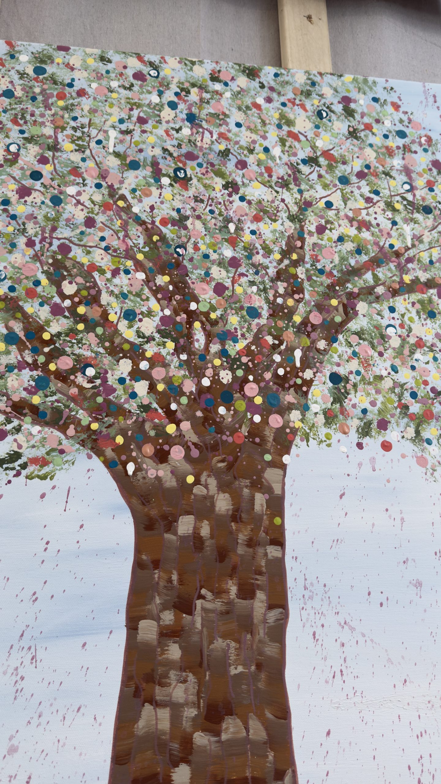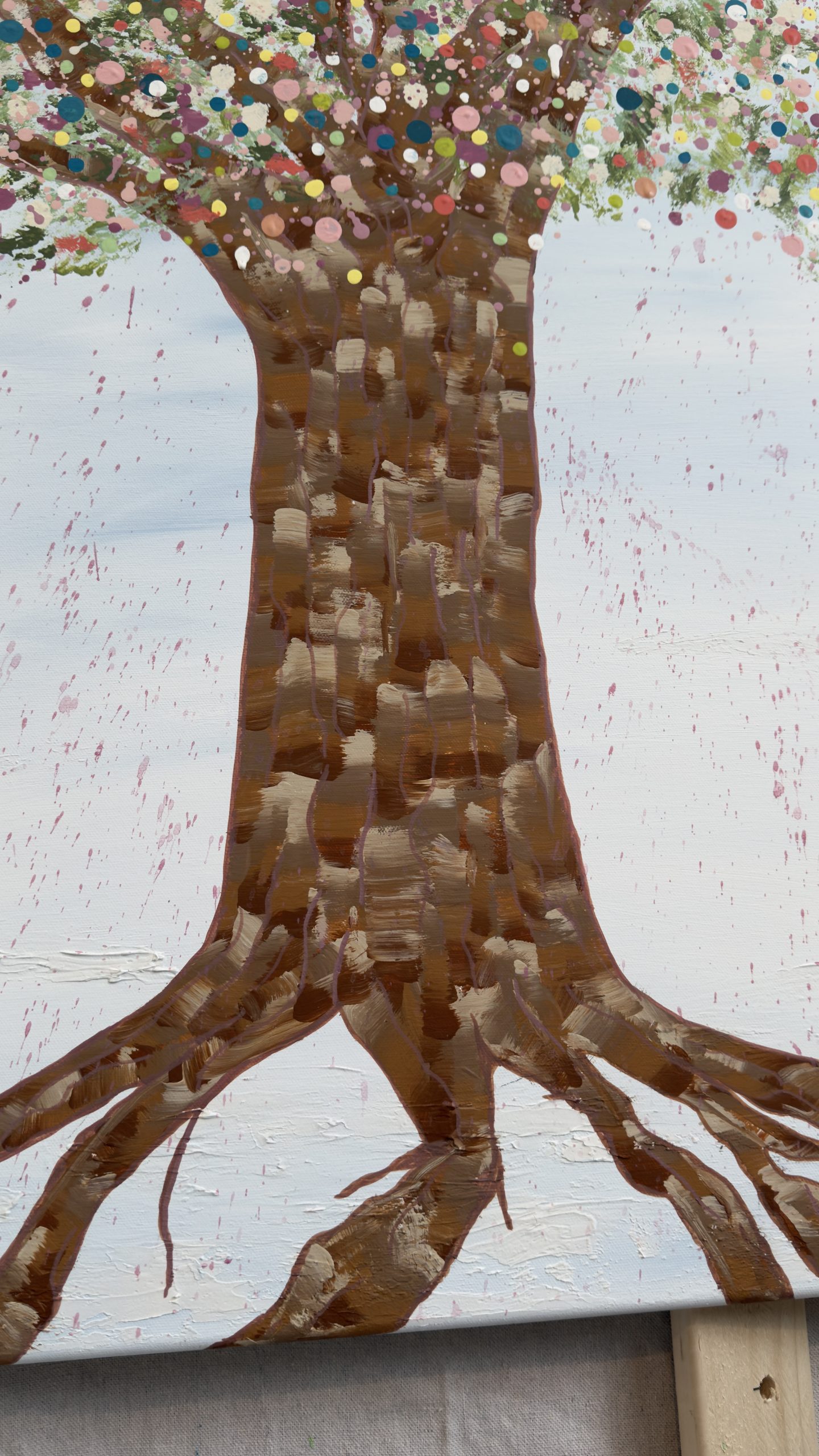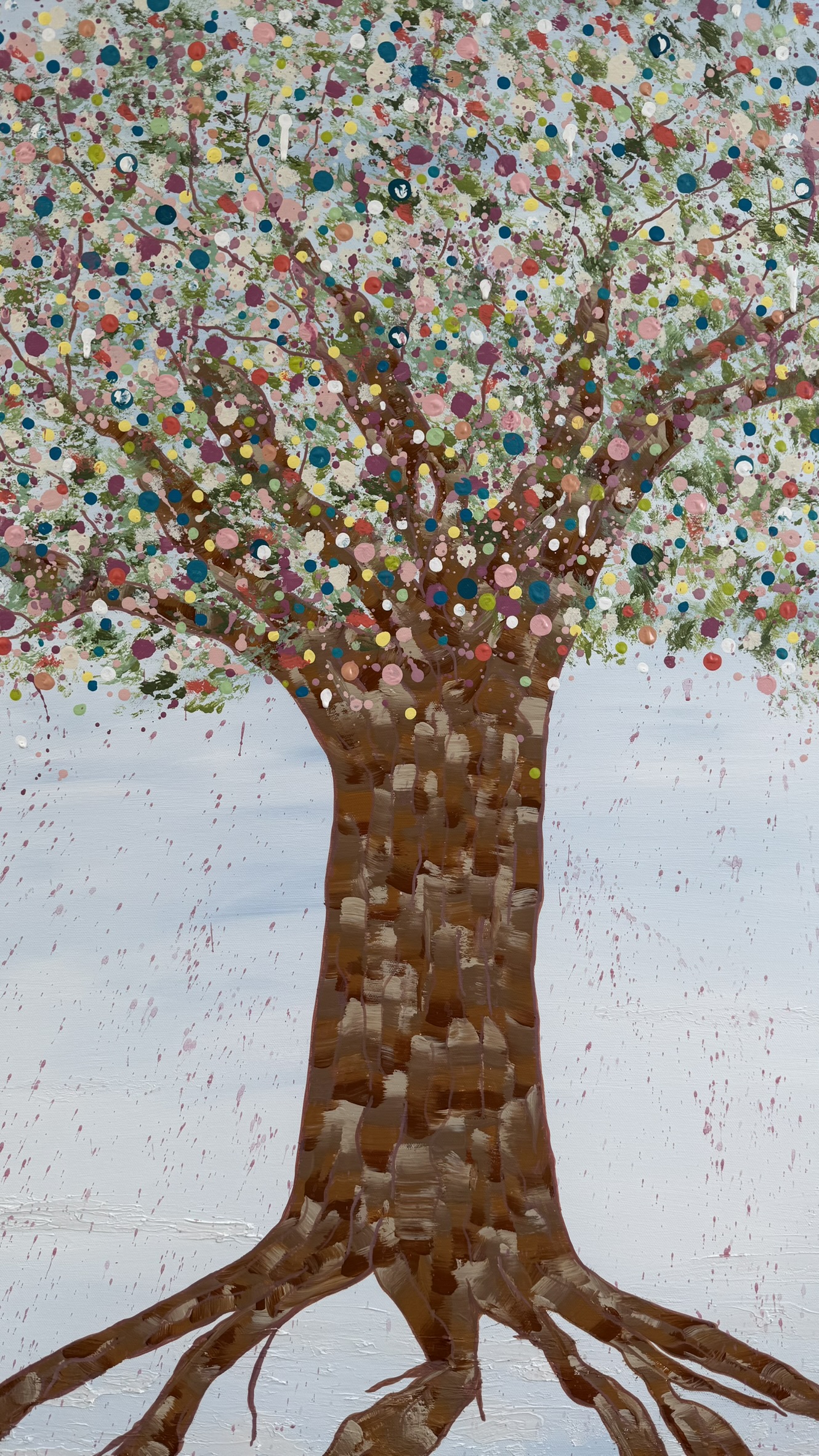 Above, her canopy opens into a celebration of becoming. A constellation of hand-placed dots, splashes, and organic marks bloom outward — playful, expansive, and alive. These thousands of gestures move like memories, moments, and emotions released, creating a sense of motion, joy, and sacred chaos. It feels like permission. Like breath. Like life returning.