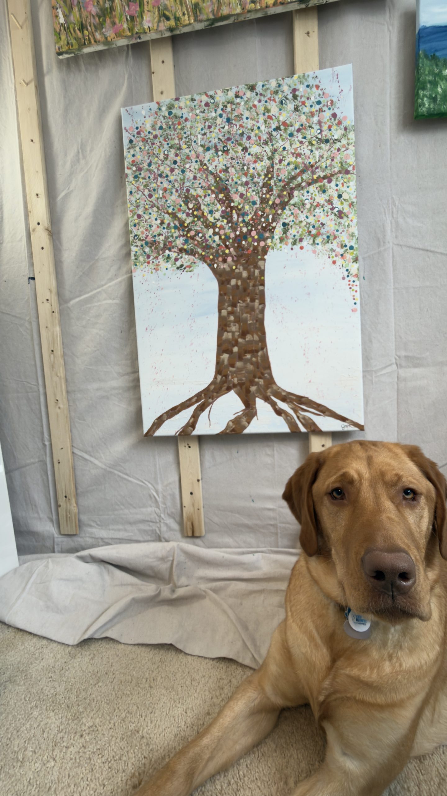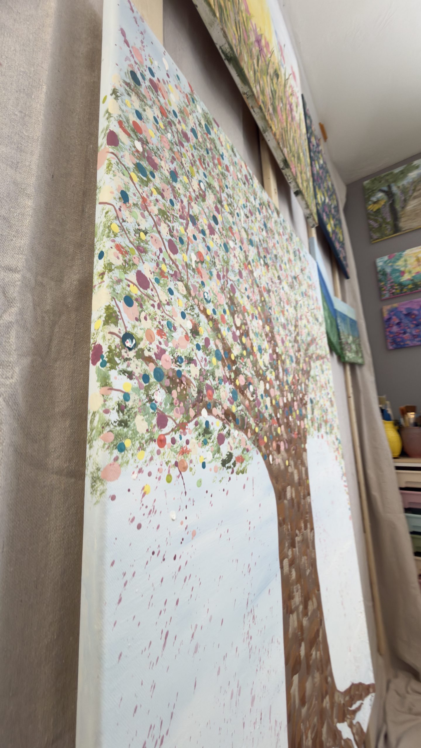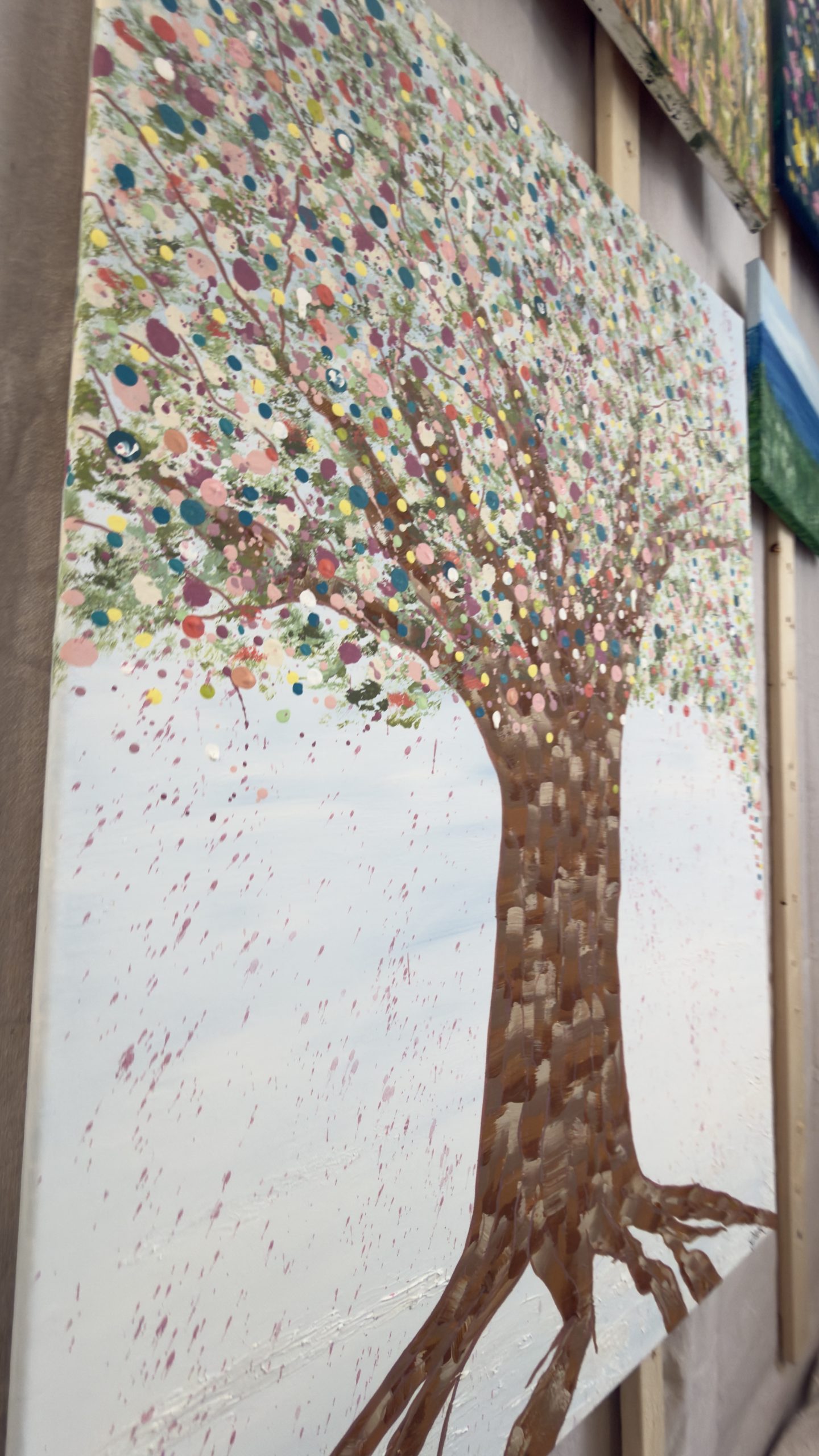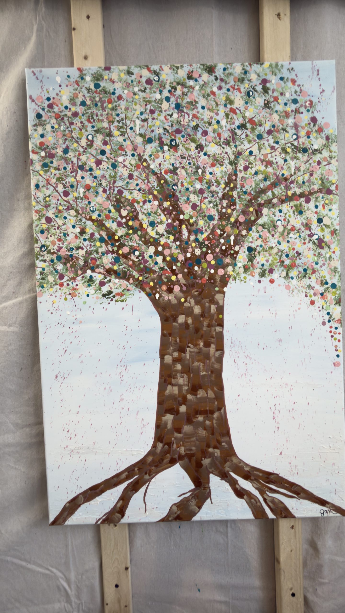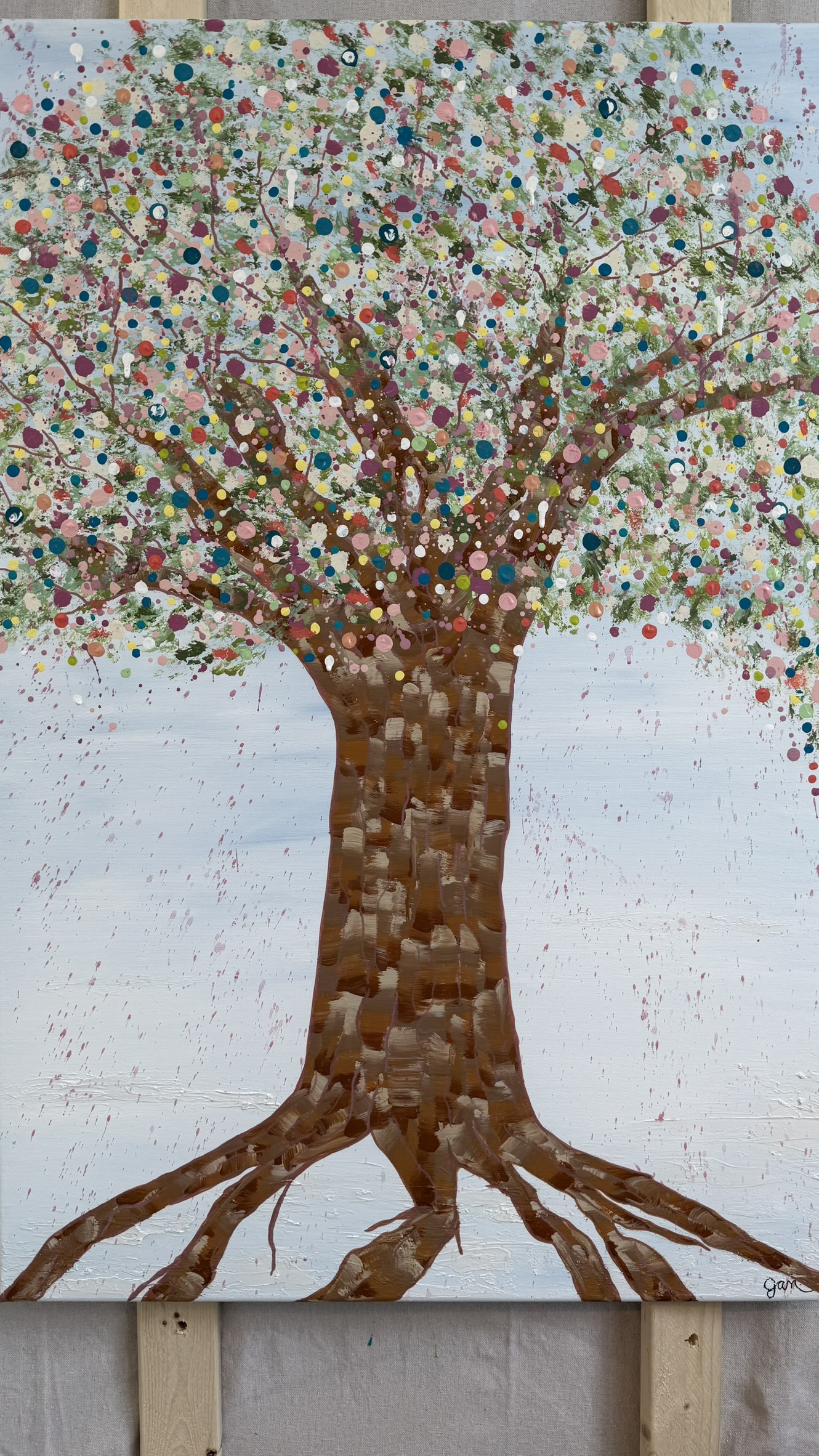 Above, her canopy opens into a celebration of becoming. A constellation of hand-placed dots, splashes, and organic marks bloom outward — playful, expansive, and alive. These thousands of gestures move like memories, moments, and emotions released, creating a sense of motion, joy, and sacred chaos. It feels like permission. Like breath. Like life returning.