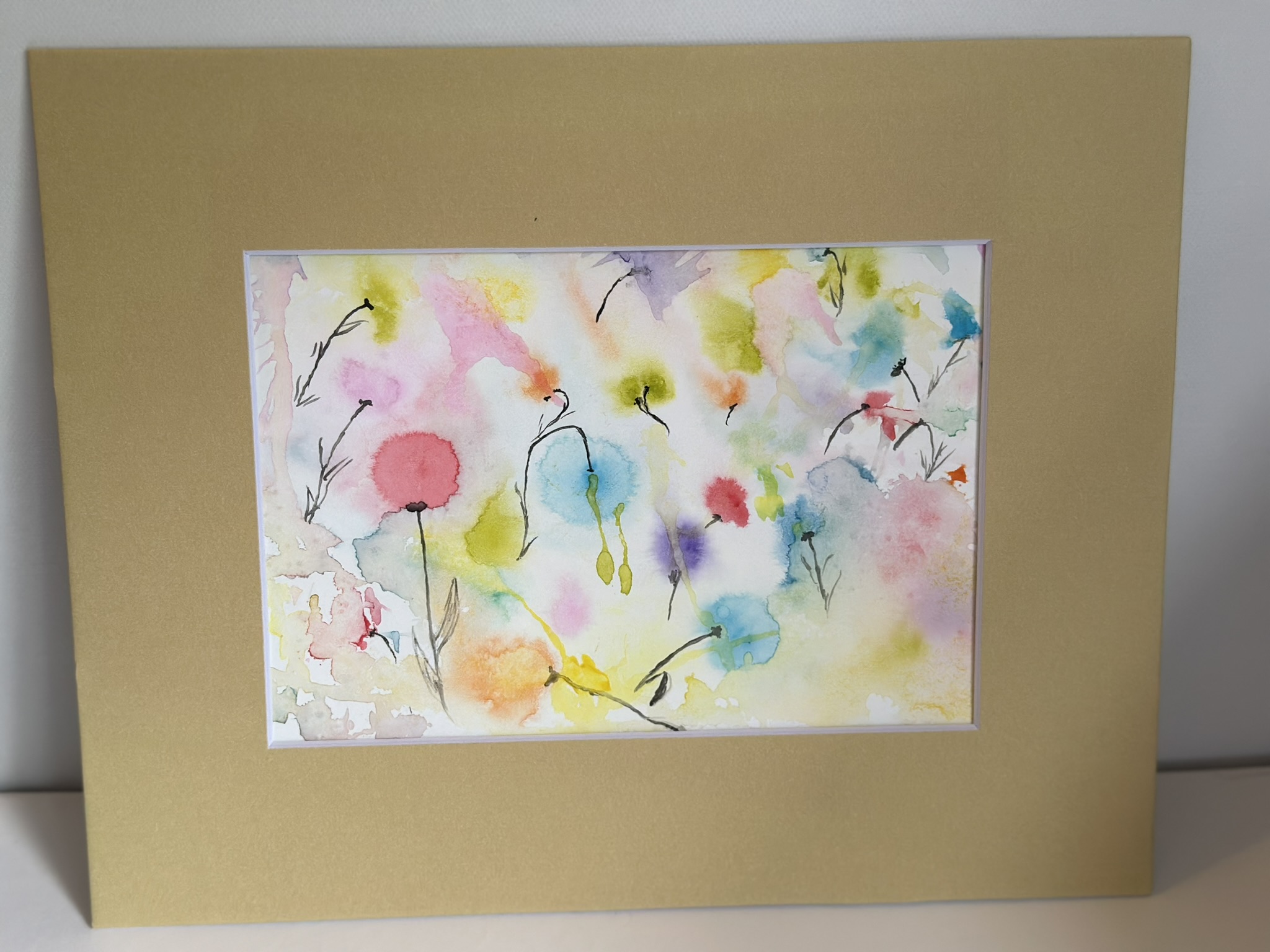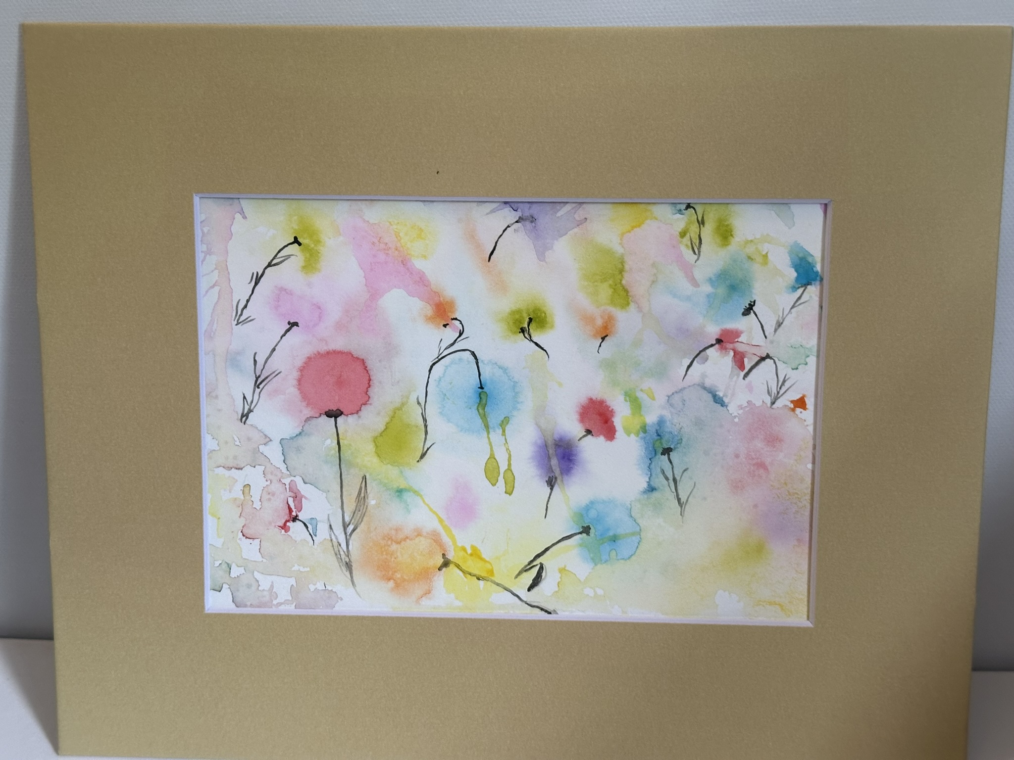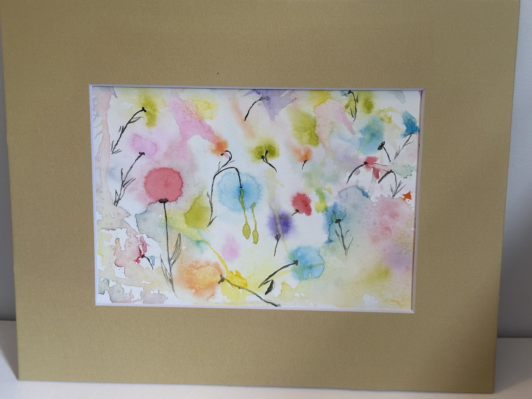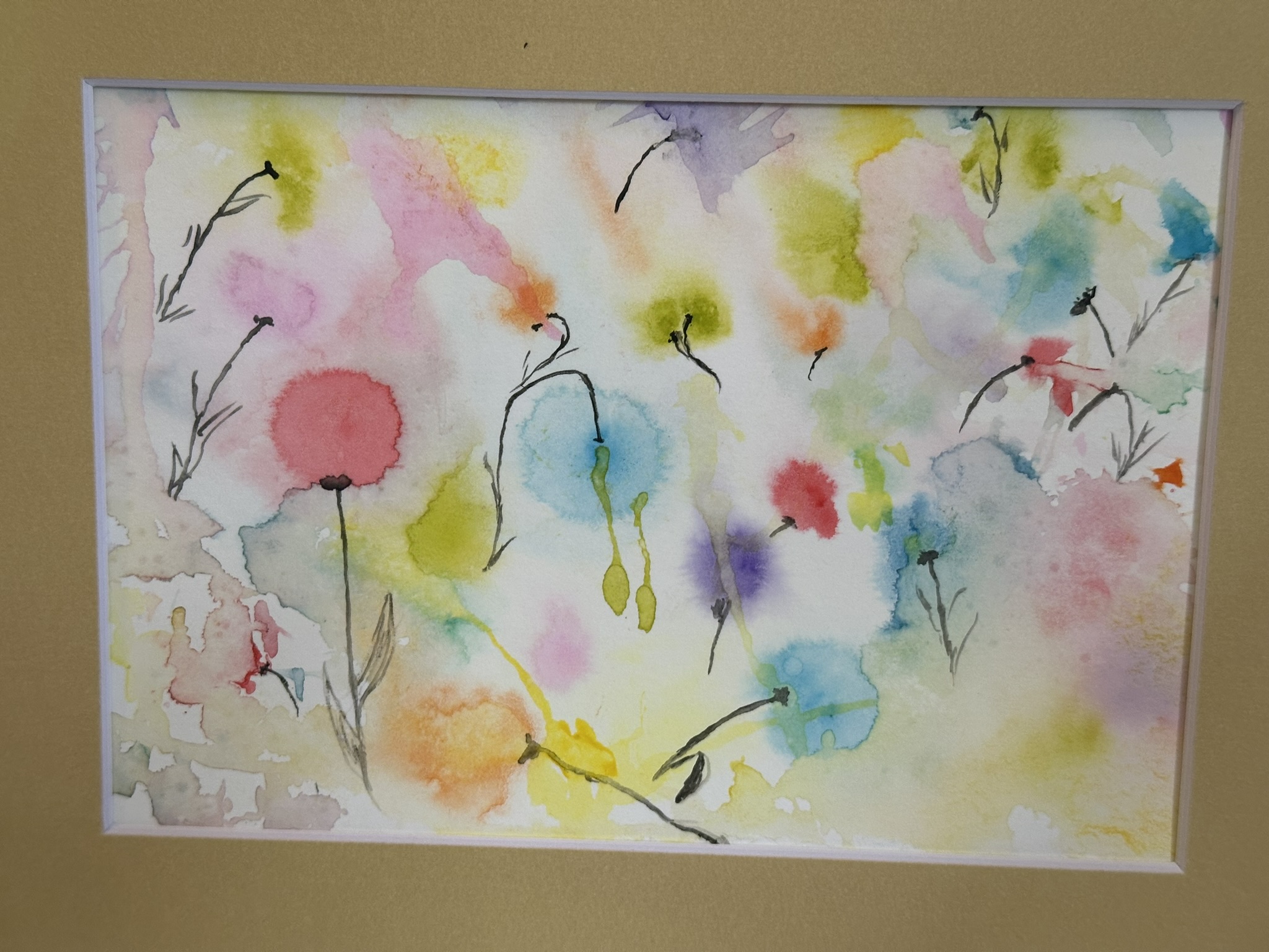This painting captures the tranquil beauty of a garden under a gentle rainfall. The soft, diffused watercolors mimic the effect of raindrops blending into a canvas of lush greenery and delicate flowers. Each splash of color resembles a raindrop dissolving into vibrant pools, creating a dreamlike atmosphere. The subtle interplay of pastel hues conveys the serene and refreshing ambiance of a rainy day, while the golden frame adds a touch of warmth to the cool, rain-washed scene.