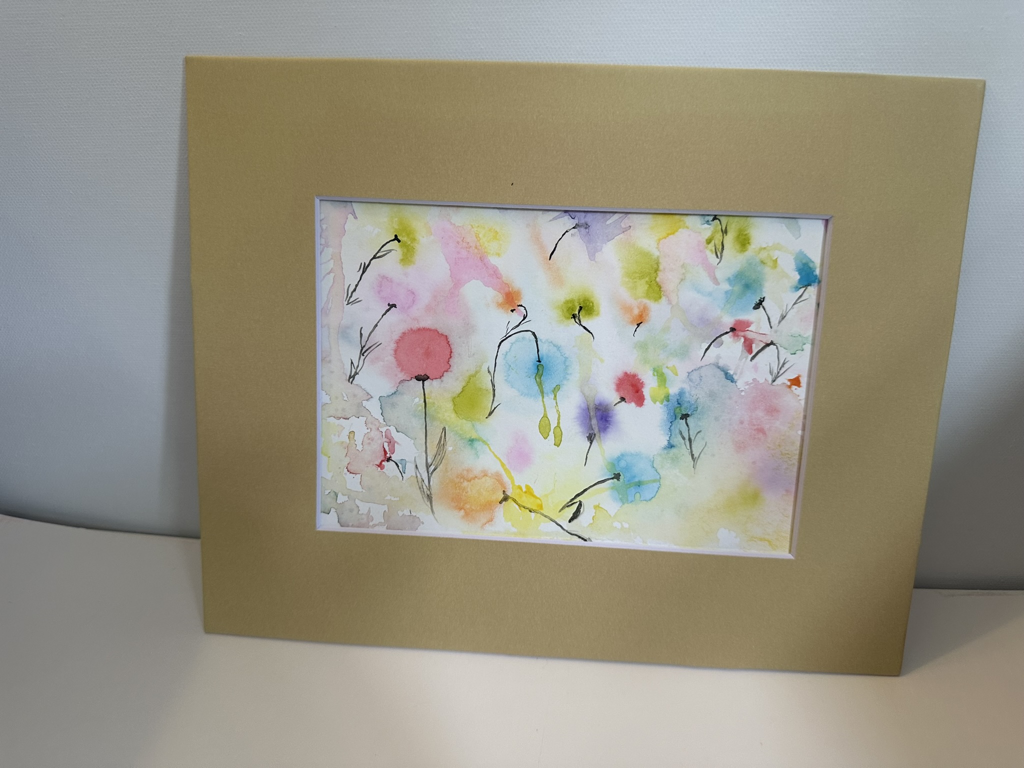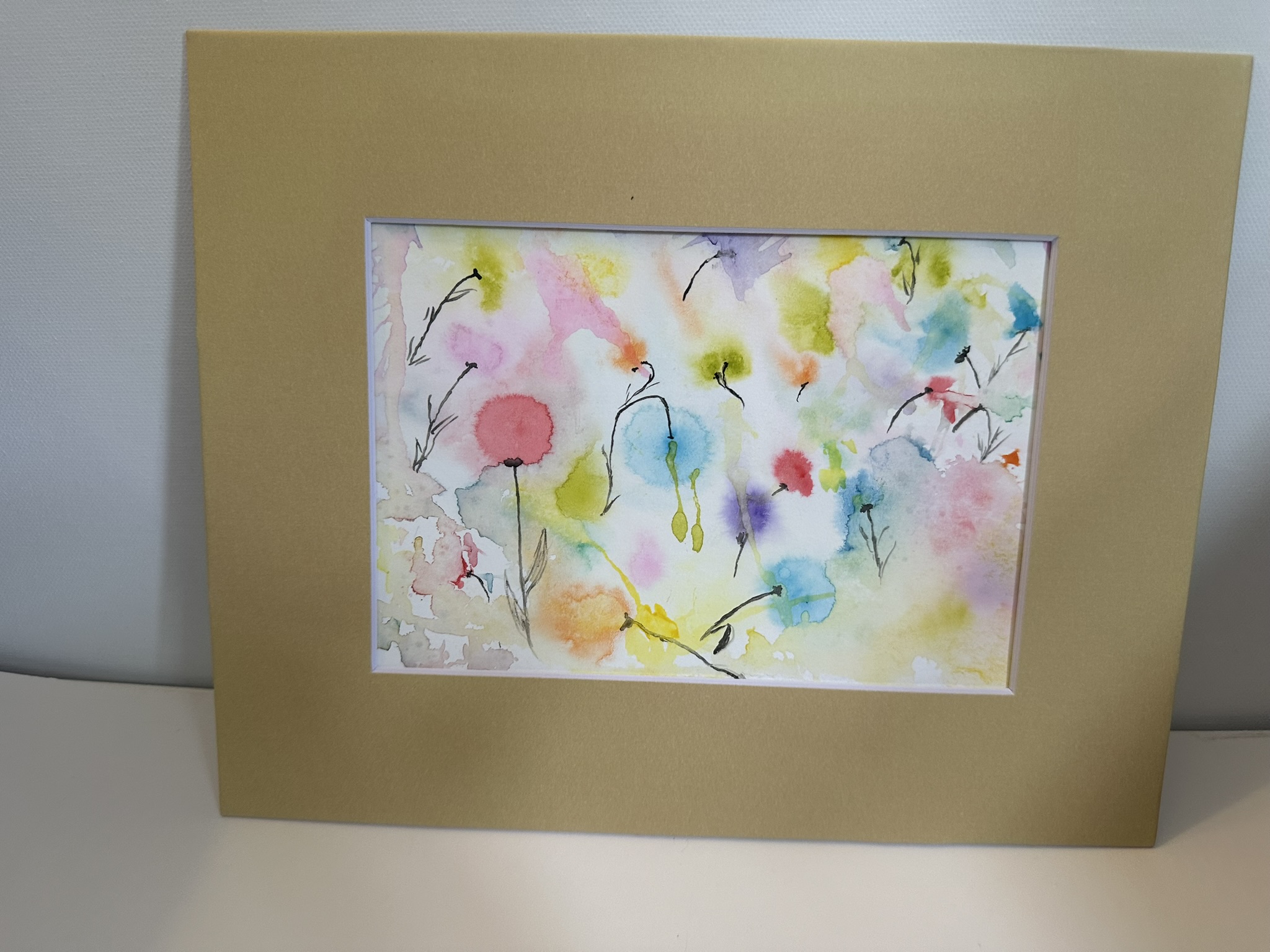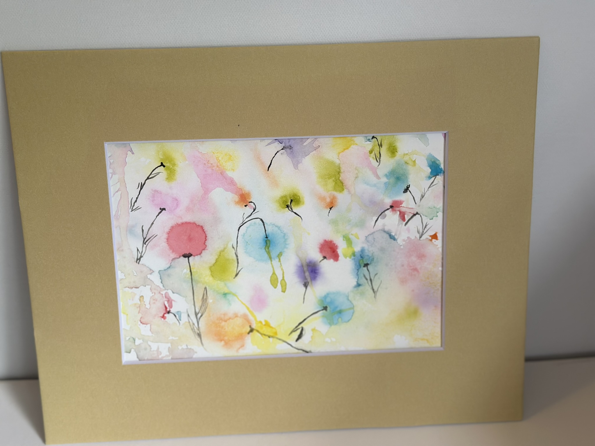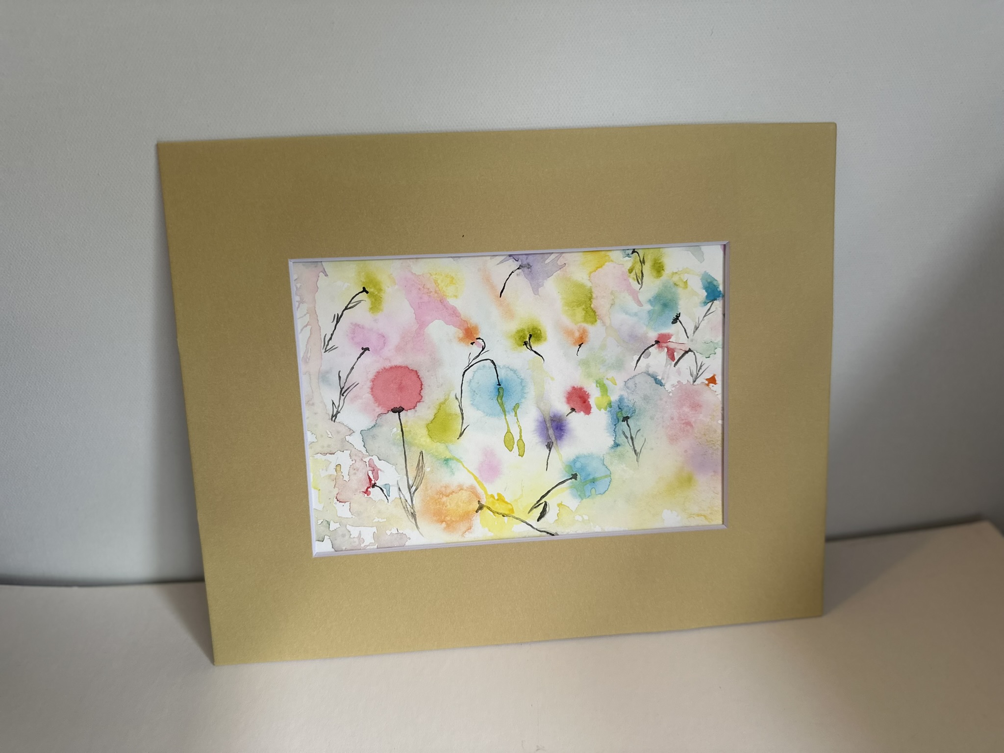 This painting captures the tranquil beauty of a garden under a gentle rainfall. The soft, diffused watercolors mimic the effect of raindrops blending into a canvas of lush greenery and delicate flowers. Each splash of color resembles a raindrop dissolving into vibrant pools, creating a dreamlike atmosphere. The subtle interplay of pastel hues conveys the serene and refreshing ambiance of a rainy day, while the golden frame adds a touch of warmth to the cool, rain-washed scene.
