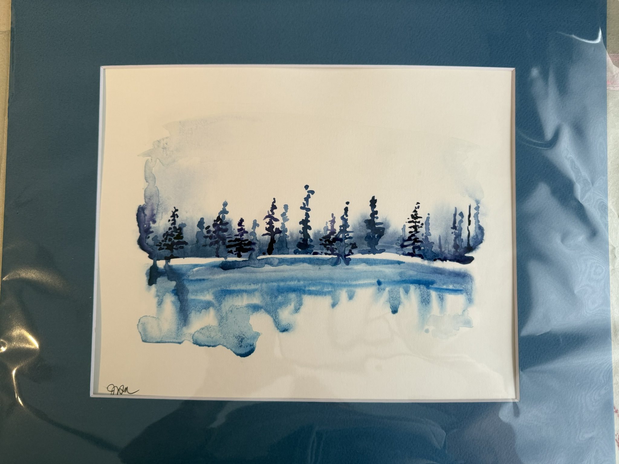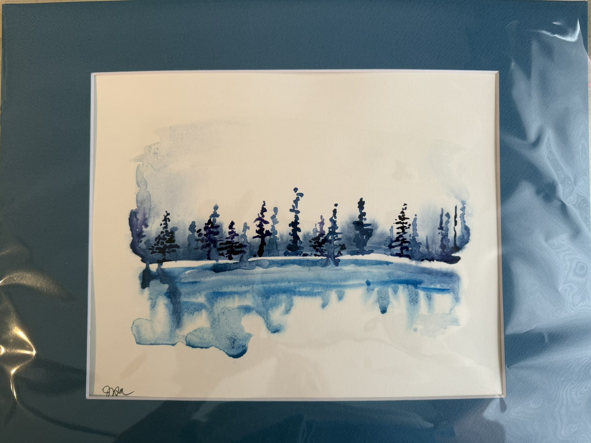In this minimalist yet captivating watercolor, a row of deep blue evergreens stands quietly along the edge of a still lake. Their silhouettes ripple gently in the mirrored water below, surrounded by soft washes of indigo and sky blue. “Still Waters” captures a moment of perfect calm, inviting the viewer to pause and breathe in its tranquility.