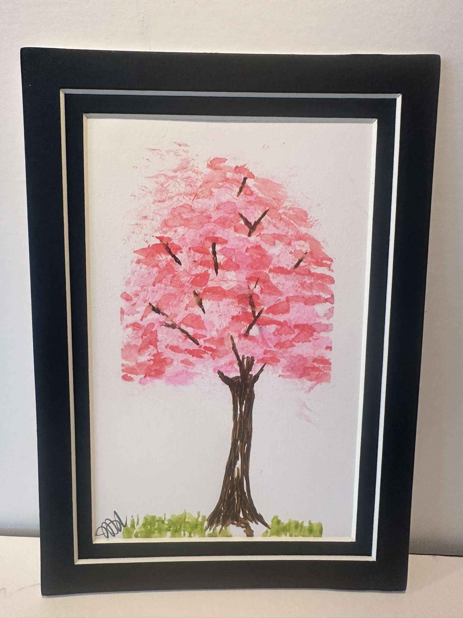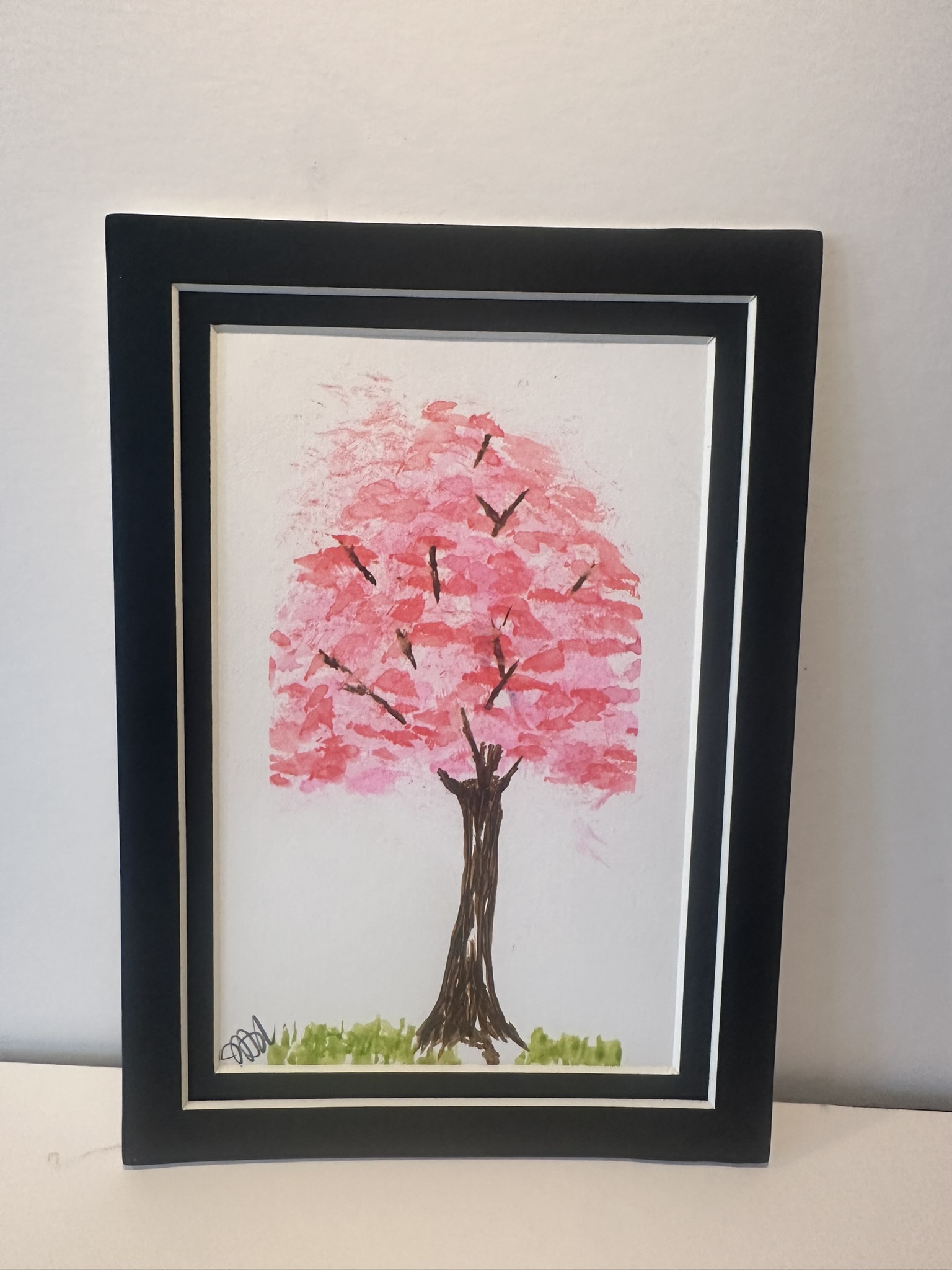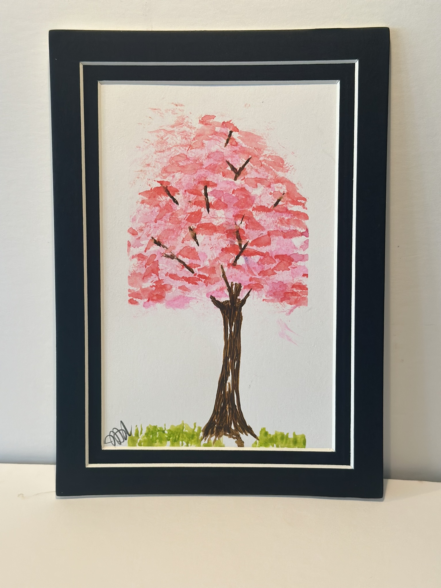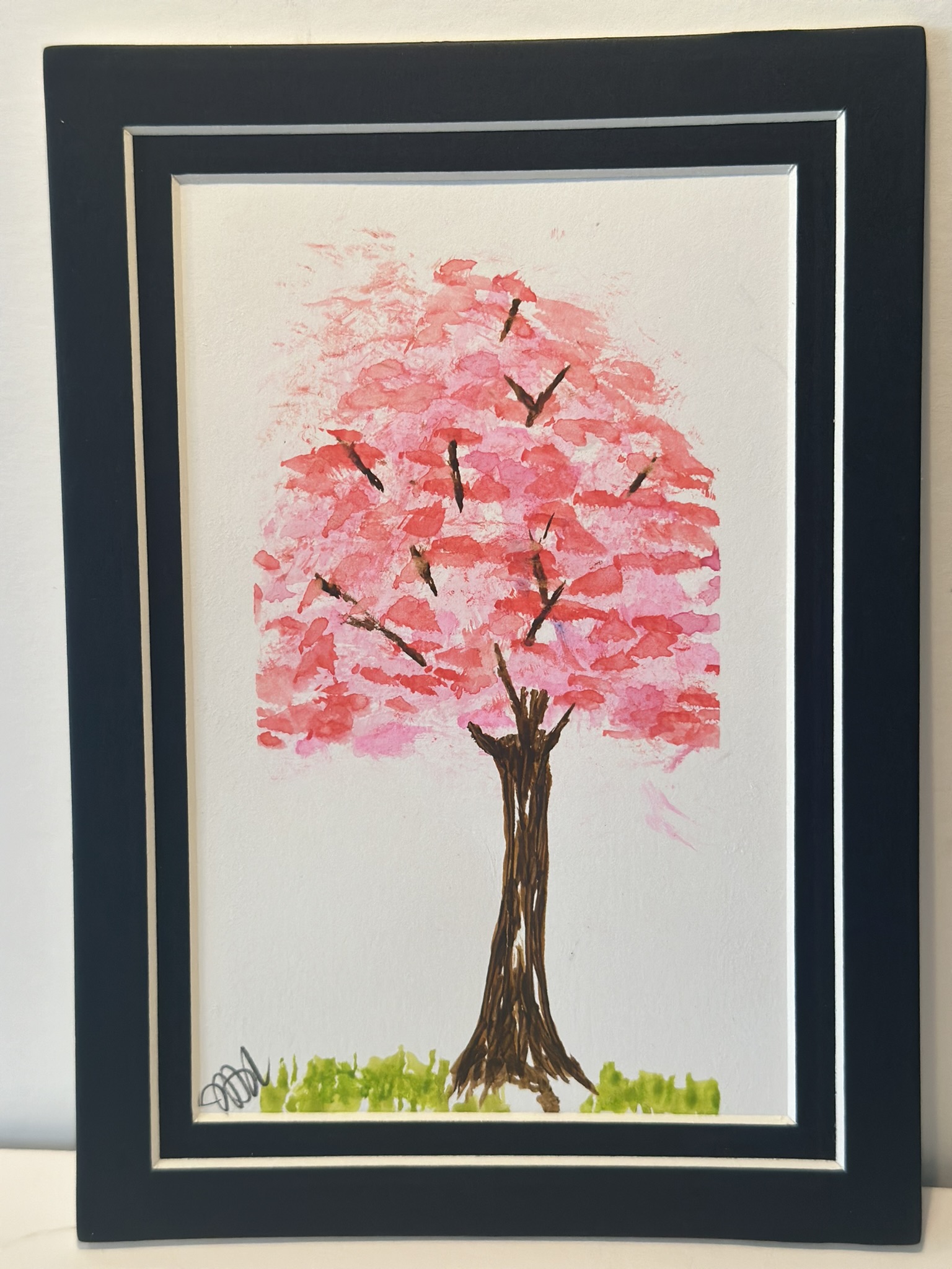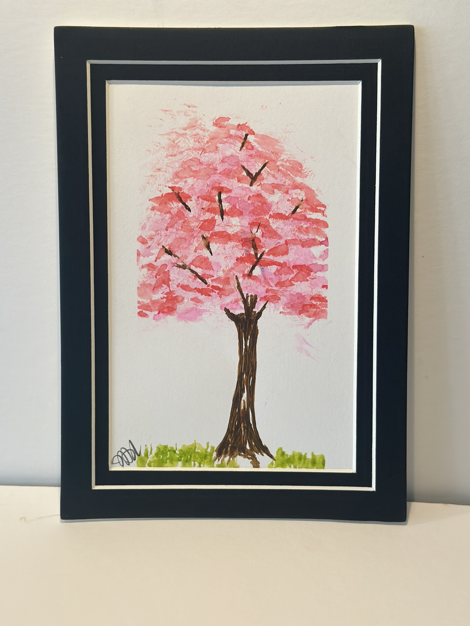 The painting features a robust tree with a lush canopy of pink foliage, likely representing the cherry blossoms of spring. The birds flying among the branches add a dynamic element to the scene, while the simple green underbrush grounds the image. The contrast of the black frame with the white mat emphasizes the vivid colors and the liveliness of the scene.